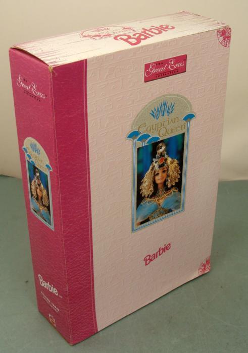 This is the Egyptian Queen Barbie from the Great Eras Collection, released in 1993 by Timeless Creations, the Collectible Specialty Doll division of Mattel. She is in a Nile blue gown, with ornate gold and colored ornamentation. This Barbie is in Mint condition, having never been removed from the original box. The box has minor scuffs, and a slight crease on the front, but is overall in very good condition.