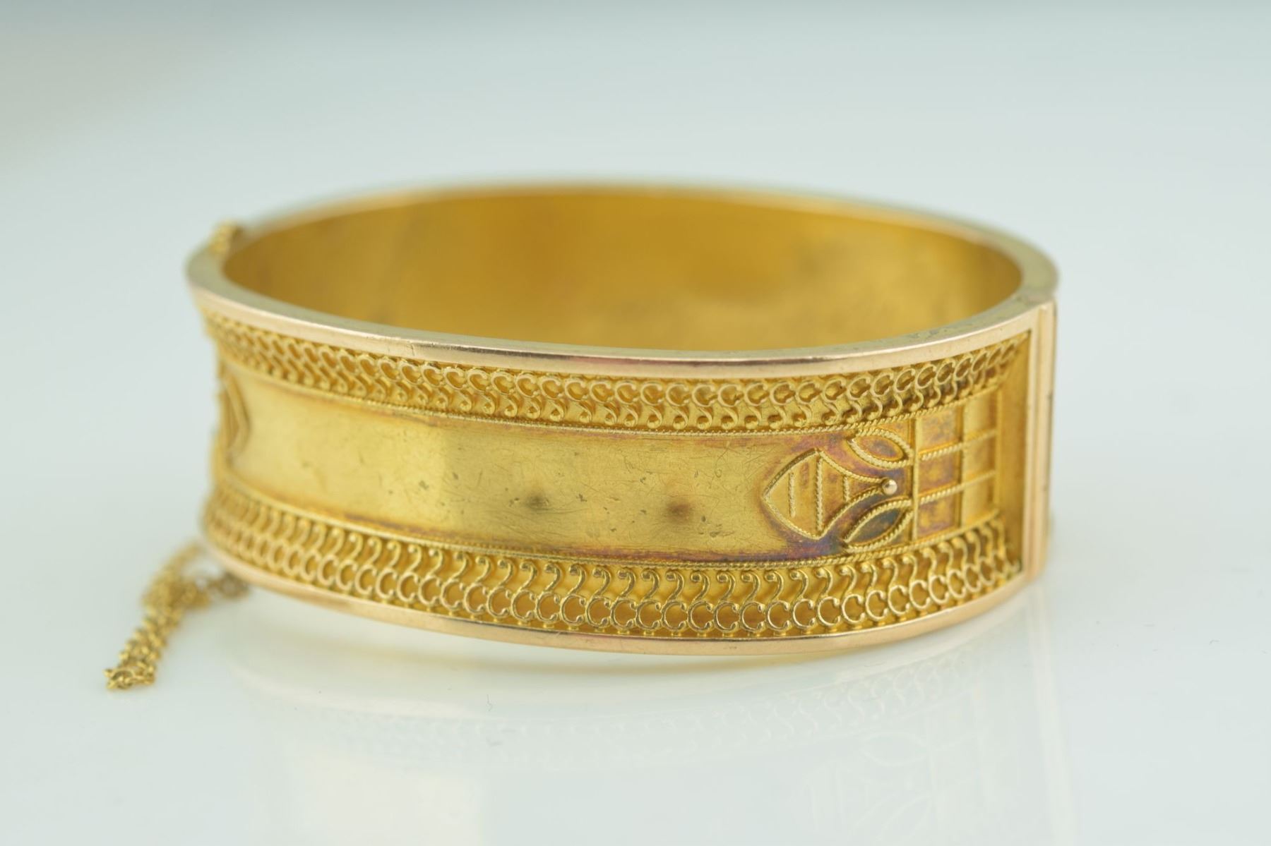 Style: Egyptian Revival 18K Antique Yellow Gold Cannetille Bangle Bracelet;