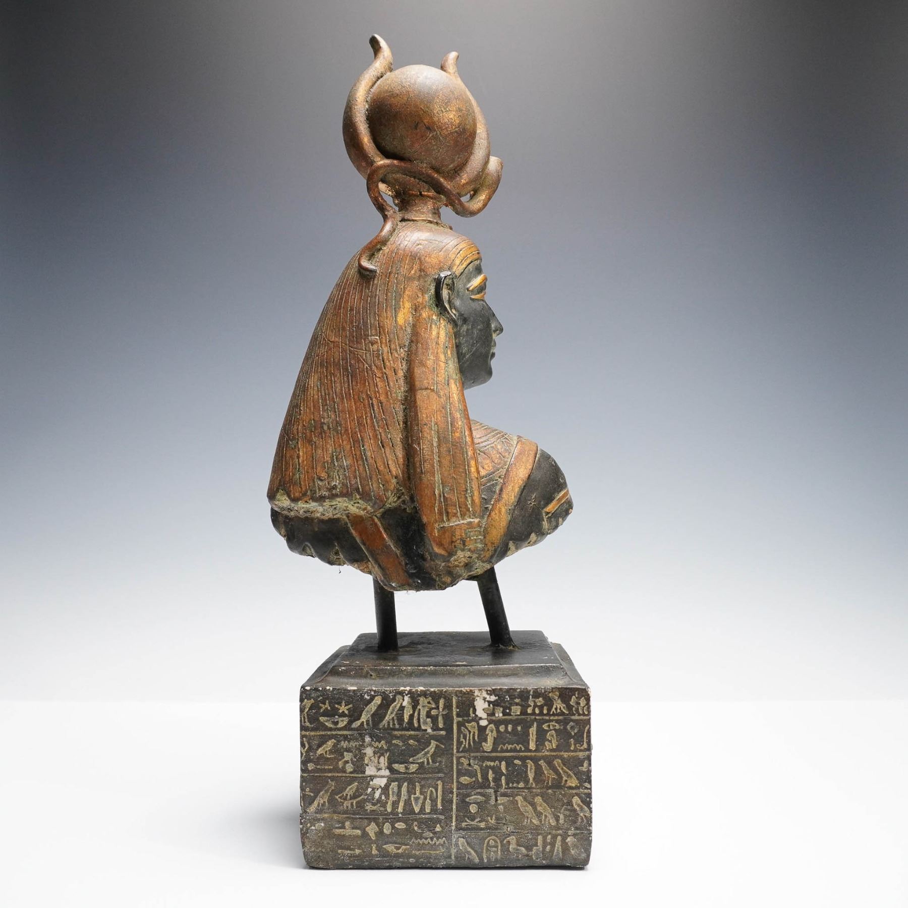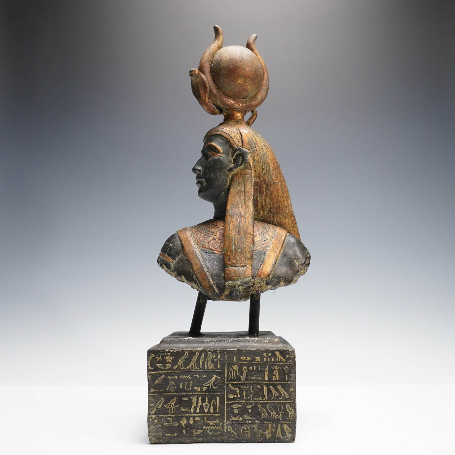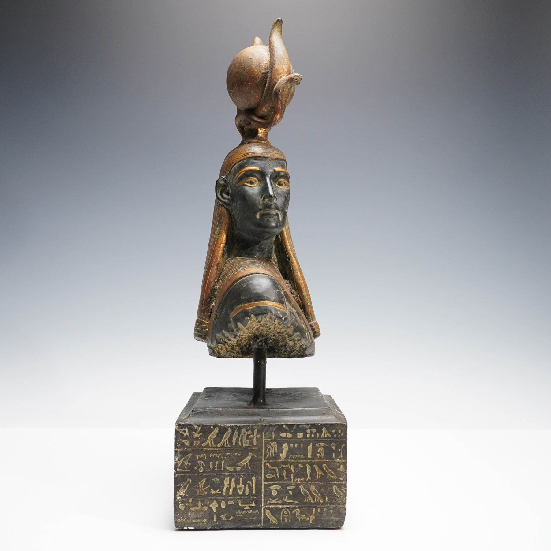 A stylized bust of the ancient Egyptian goddess Hathor, rendered in painted resin and mounted on a square plinth incised with imitation hieroglyphs. Hathor is depicted with serene expression, braided hair, and the traditional headdress of cow horns encircling the solar disk which symbols of her celestial and maternal attributes in ancient Egyptian mythology. The surface bears traces of bronze and gilt-toned accents, lending the piece the appearance of an aged antiquity.