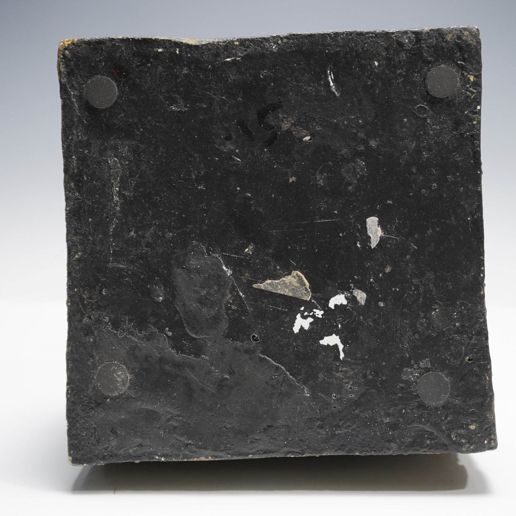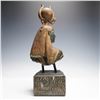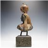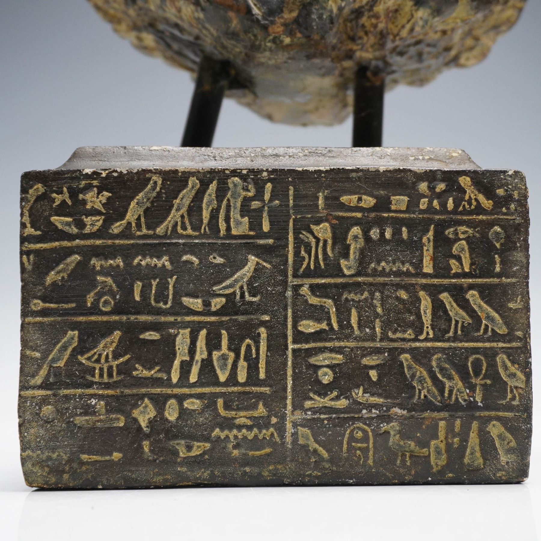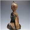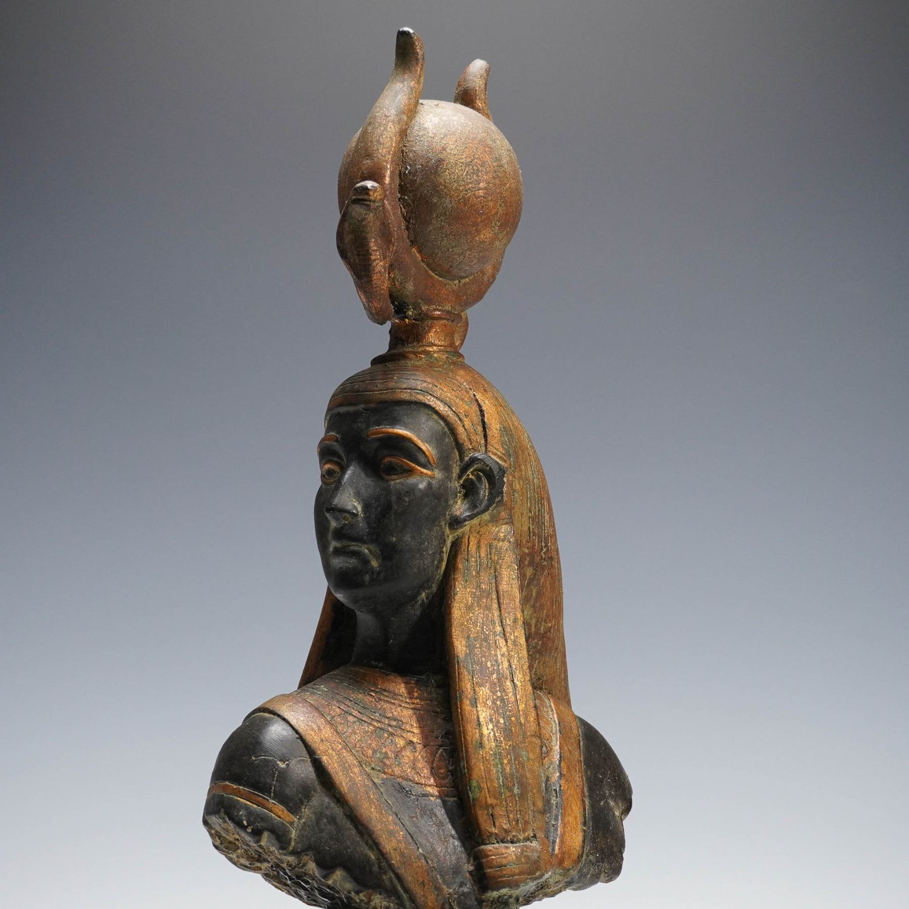 A stylized bust of the ancient Egyptian goddess Hathor, rendered in painted resin and mounted on a square plinth incised with imitation hieroglyphs. Hathor is depicted with serene expression, braided hair, and the traditional headdress of cow horns encircling the solar disk which symbols of her celestial and maternal attributes in ancient Egyptian mythology. The surface bears traces of bronze and gilt-toned accents, lending the piece the appearance of an aged antiquity.