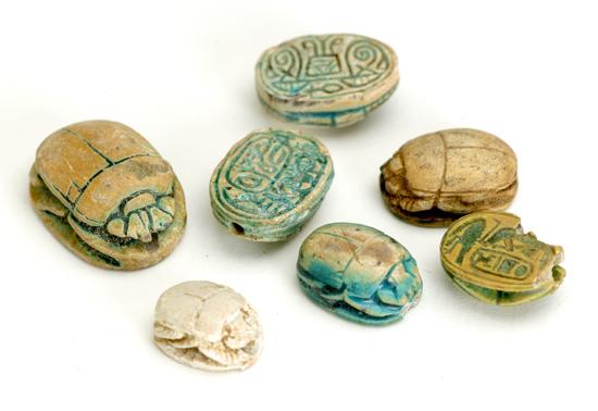 Egyptian Scarabs. Group of 7 different faience scarabs, circa 26th-30th Dynasty. All intact, one with chip. Lot of 7 items.