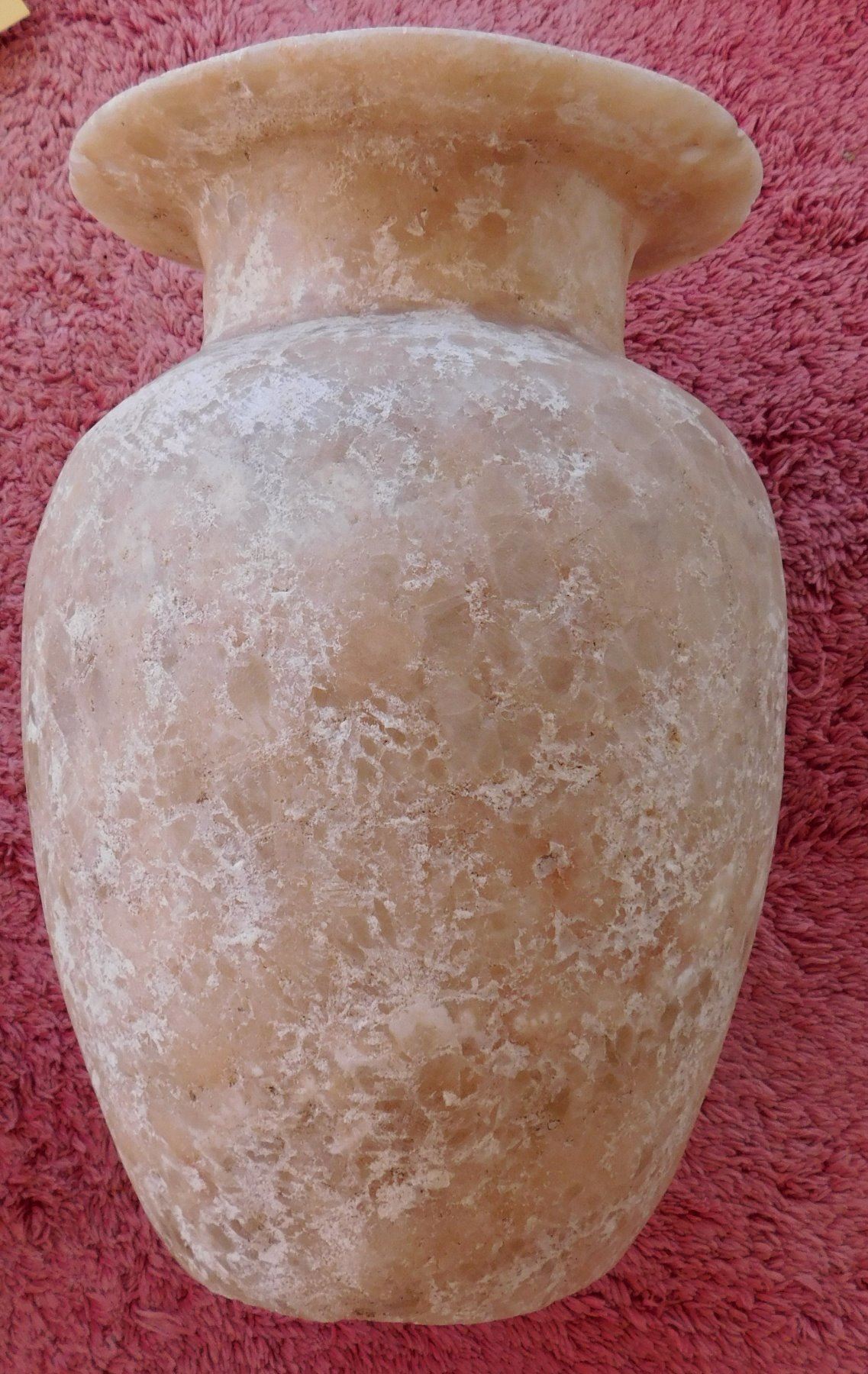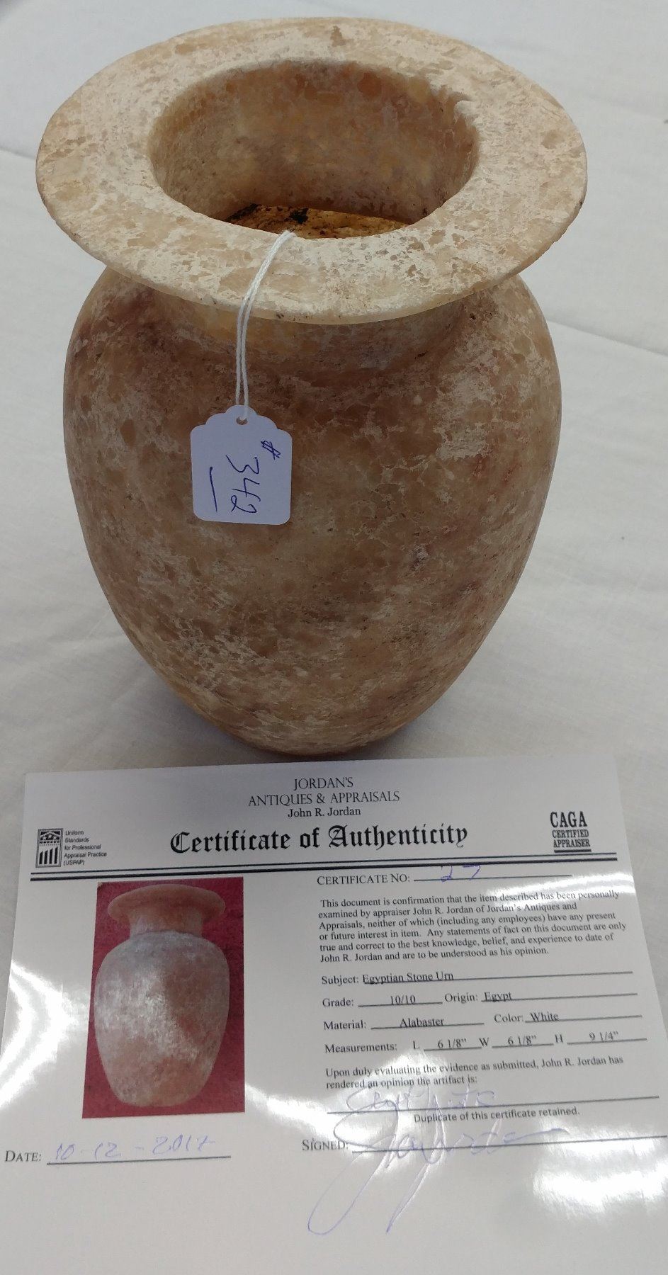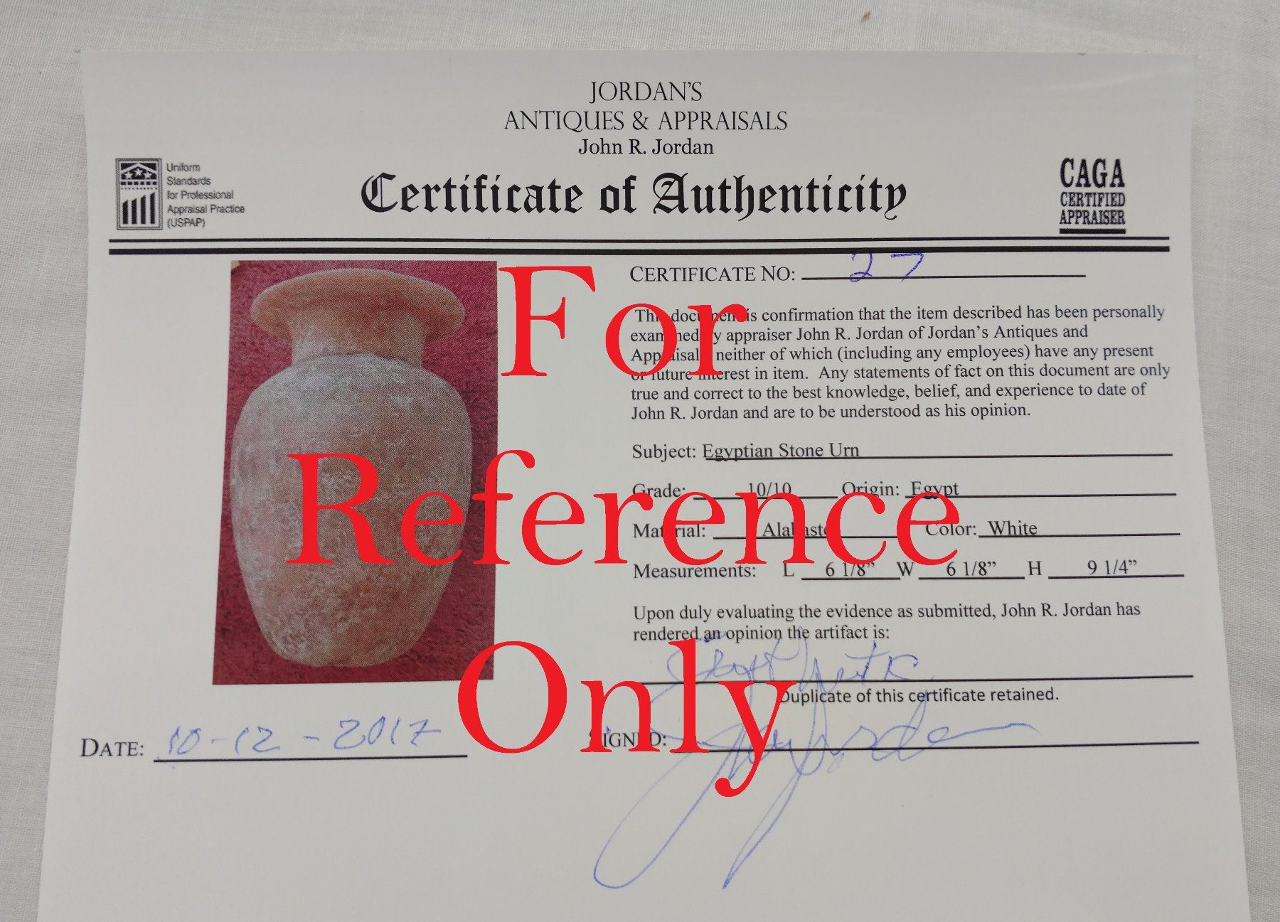 Egyptian Stone Urn w/John Jordan COA, c. 2000 years old. Made of alabaster, the item measures 6 1/8" x 6 1/8" x 9 1/4". Egyptian, Roman. John R. Jordan Certificate of Authenticity. Condition: Good, minor nicks on rim, hole in bottom, see images. Shipping: $45.00 w/insurance and signature.