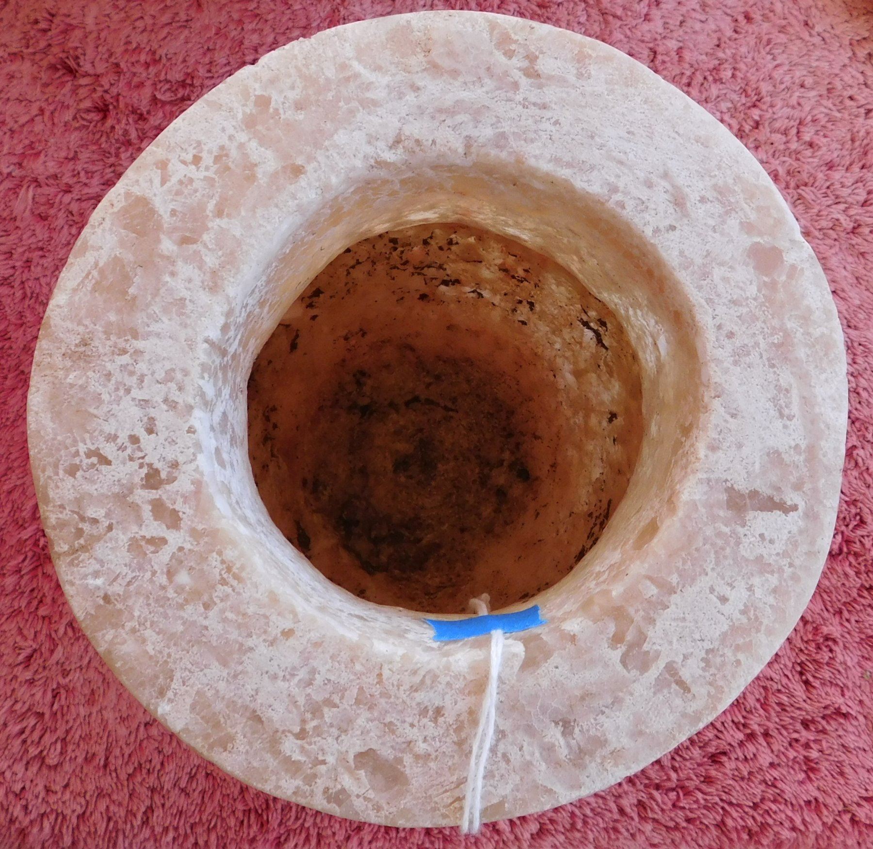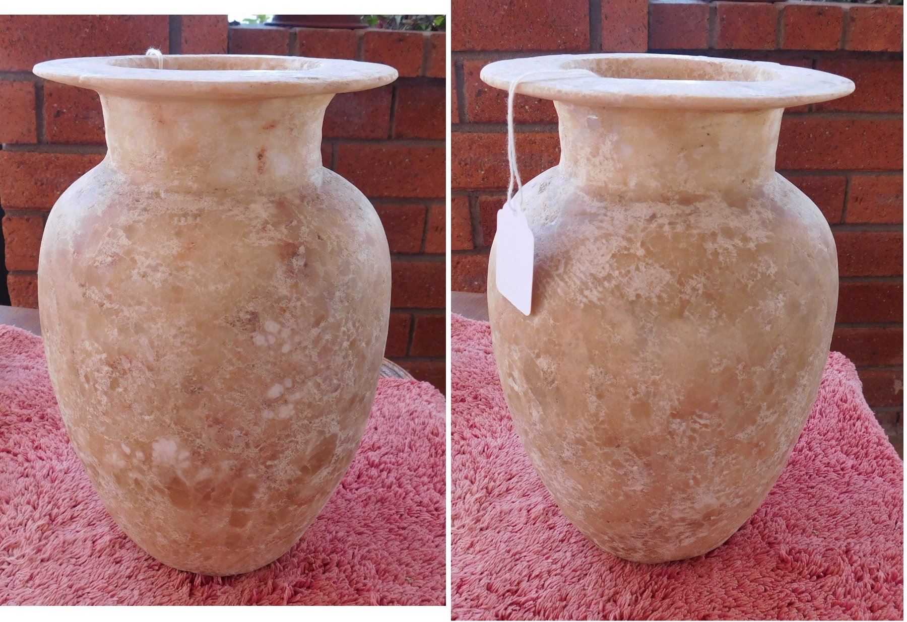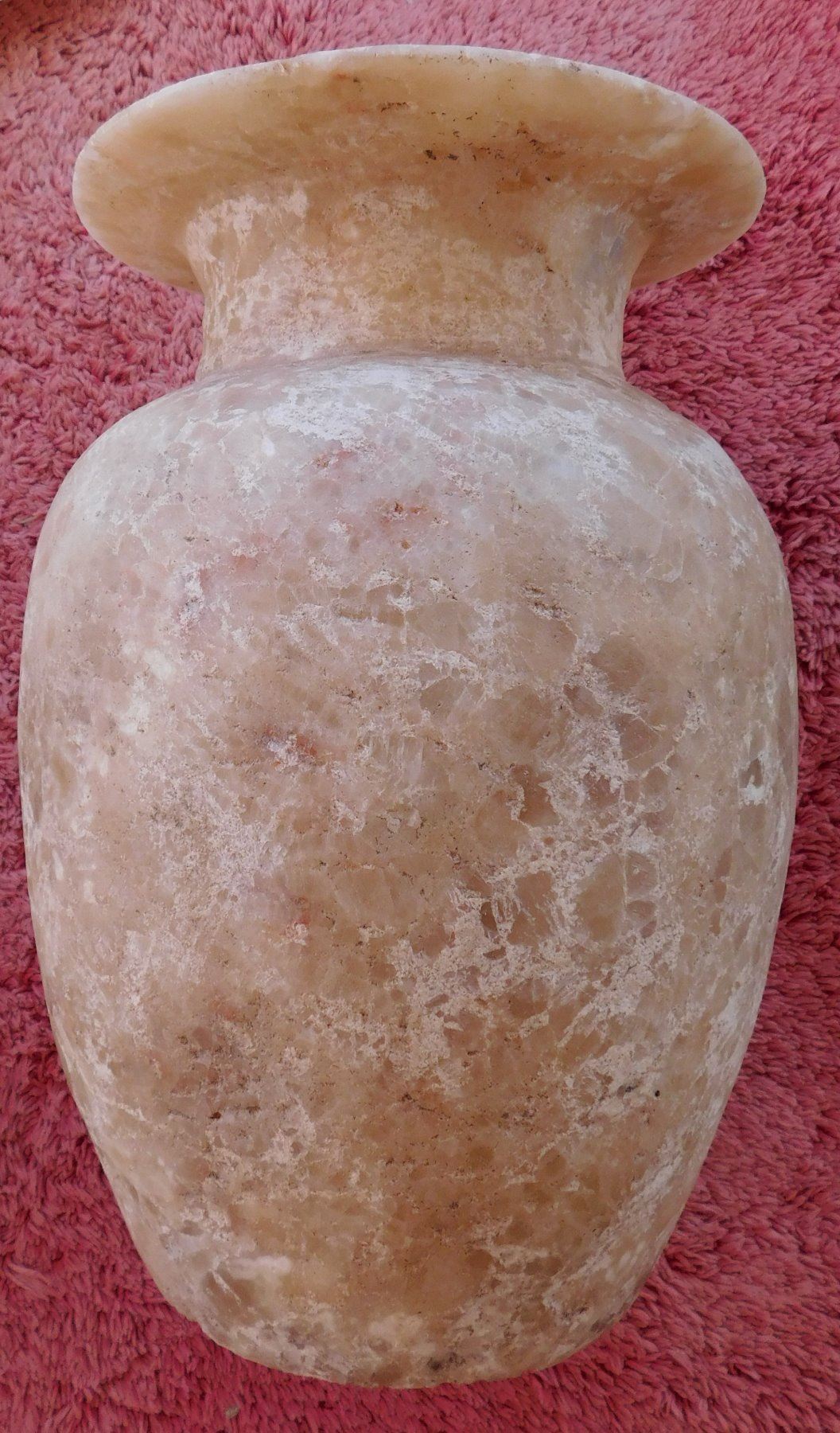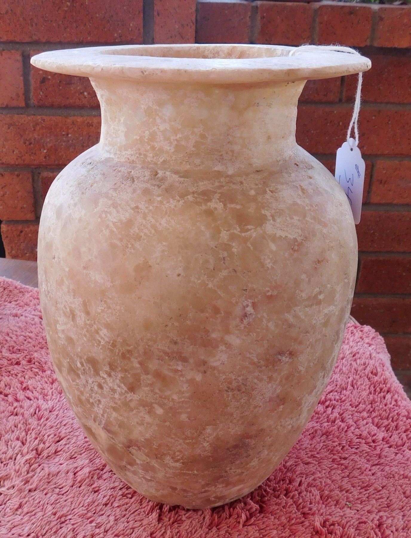 Egyptian Stone Urn w/John Jordan COA, c. 2000 years old. Made of alabaster, the item measures 6 1/8" x 6 1/8" x 9 1/4". Egyptian, Roman. John R. Jordan Certificate of Authenticity. Condition: Good, minor nicks on rim, hole in bottom, see images. Shipping: $45.00 w/insurance and signature.