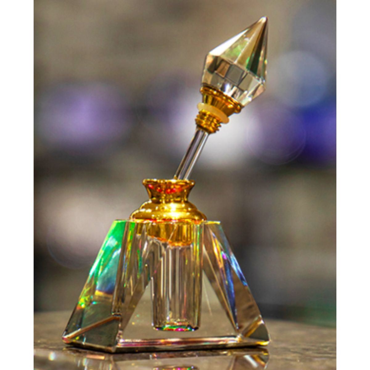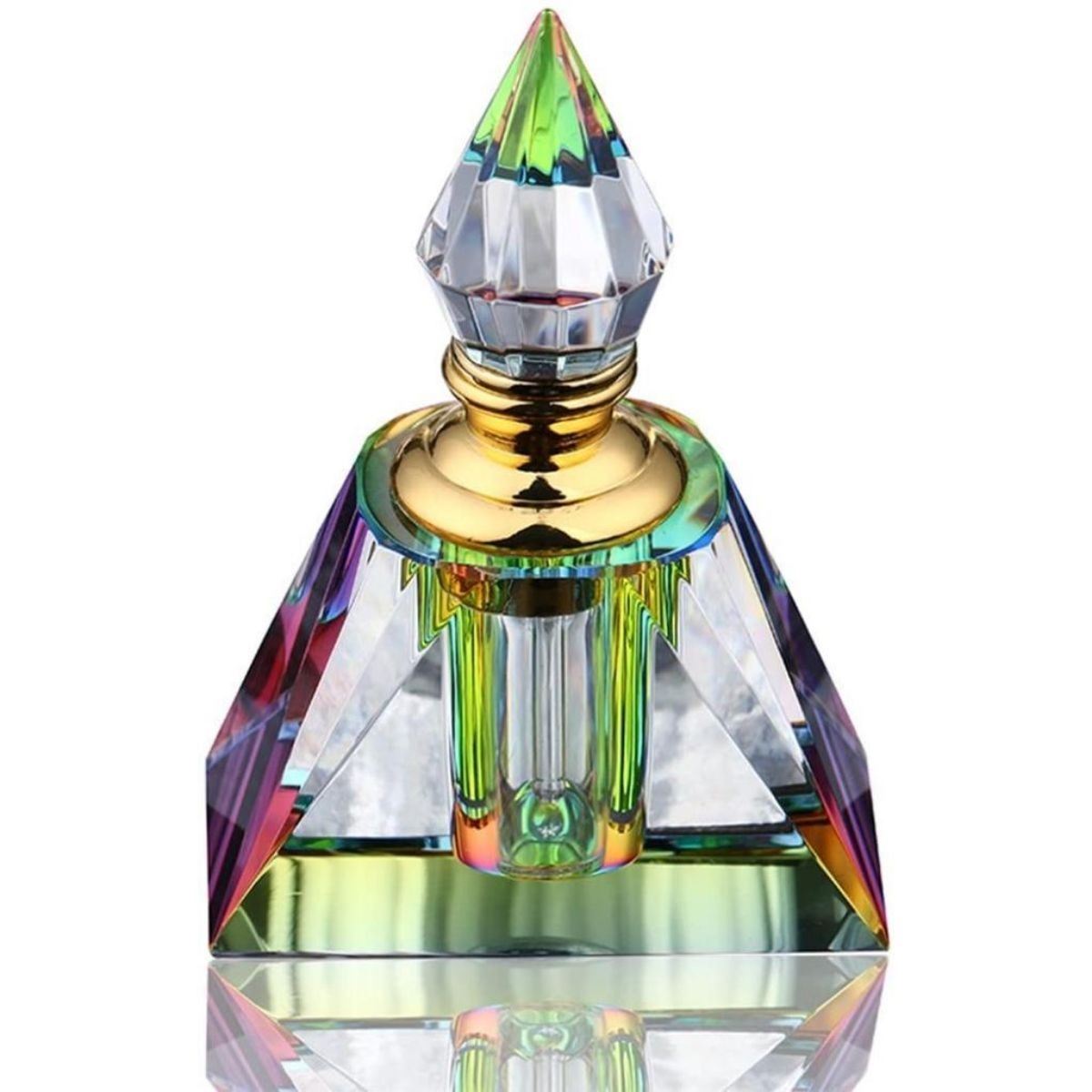 Egyptian-style glass pyramid refillable perfume bottle. 3 ml size. the top with glass dropper. Comes with gift box. 3" H X 2" W.Â
