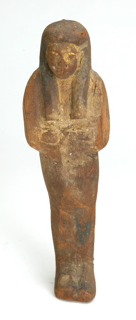 Egyptian Wood Ushabti. 19th Dynasty, 1550-1070 B.C. Carved wooden mummiforn figure, wears the royal wig with arms folded across chest. A few areas of original painted surface remain, deep brown natural wood surface with old mellow patina. Old loss to both sides of the arms, otherwise intact. Height 7¾" .