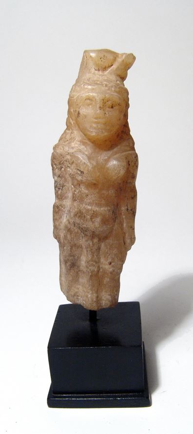 An Egyptian alabaster figure of the goddess Hathor, Late Period, c. 64 - 30 BC, wearing a tight-fitting gown and a headdress composed of cow's horns and a solar disk. Her features are rounded and quite attractive and her figure full with arms held tight to her sides. H: 4 1/3 in (11cm). A very attractive and rare piece carved in semi-translucent stone with mineral deposits throughout. Mounted on a custom base. Ex Suffolk, UK private collection.