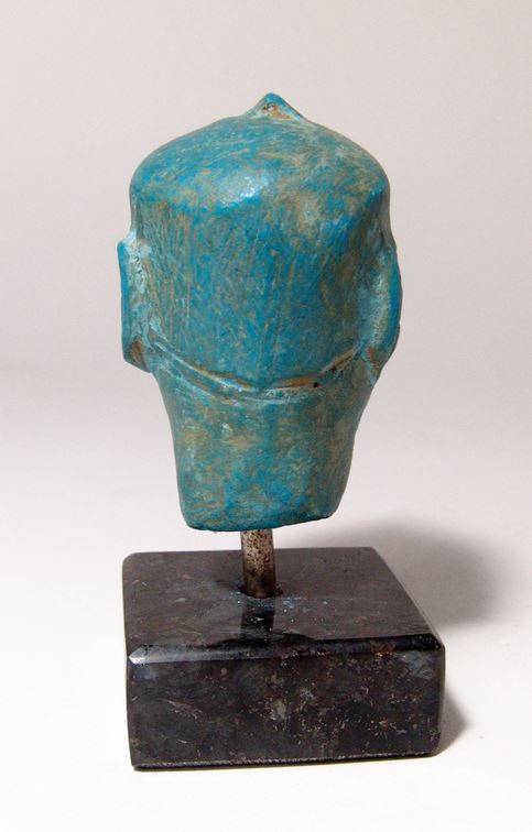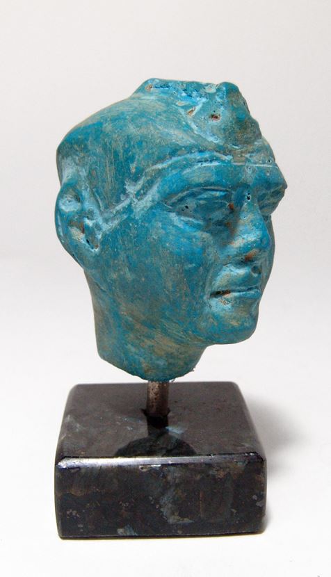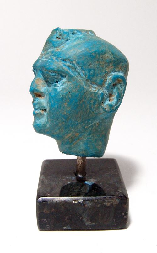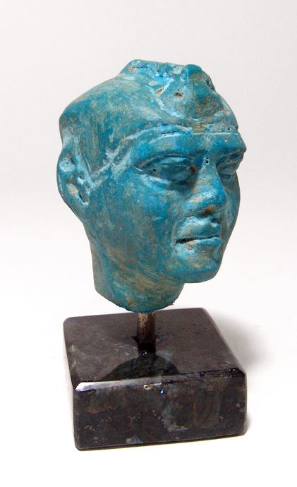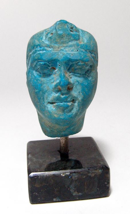 An Egyptian blue composition head of a man, Roman Period, c. 1st Century AD, perhaps a pharaoh or emperor, wearing tight-fitting headdress with uraeus, his face quite handsome, his ears outside the headdress. H: 2 ½ in (6.4 cm). A choice piece with light deposits throughout. Mounted. Ex Ligabue Collection, Venice.