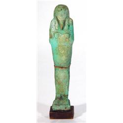 Egyptian green faience Ushabti figure on wooden base, 17cm high
