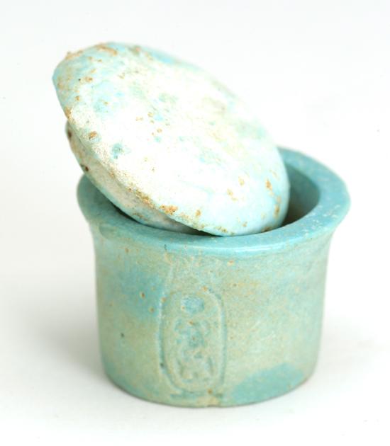 Egyptian green glaze faience Lidded Vessel of Nectanebo I. Late Period, XXX th Dynasty, 380-362 B.C. Turquoise-green in color, cylindrical in form, the exterior inscribed with the cartouche of Nectanebo I with convex lid fitted to the interior. Very Rare. Height: 1".