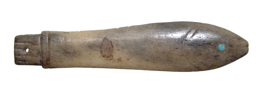 An Egyptian inlaid bone amulet of a fish, 3rd - 5th Century AD, with green paste eyes and incised detail, suspension hole through tail. L: 5 cm. Intact with wear from being worn in antiquity. Ex San Diego private collection.