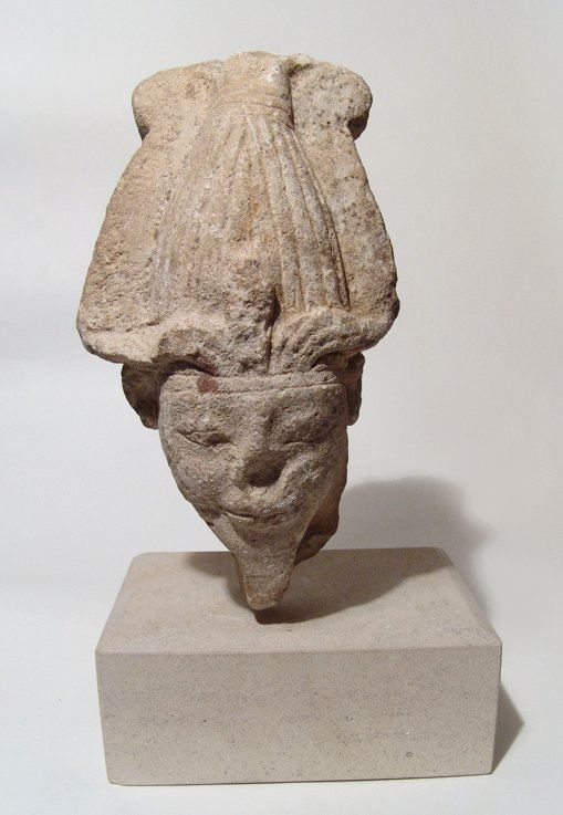 An Egyptian limestone head of Osiris, Late Period, c. 64 - 30 BC, carved to be seen from the front, wearing atef crown and uraeus, the facial features nicely detailed. H: 9 1/8 in (23.1cm). Mounted on custom stone base. Ex London collection originally purchased by the family in Al Sharqia, Egypt in the early 1900's and passed on by descent.