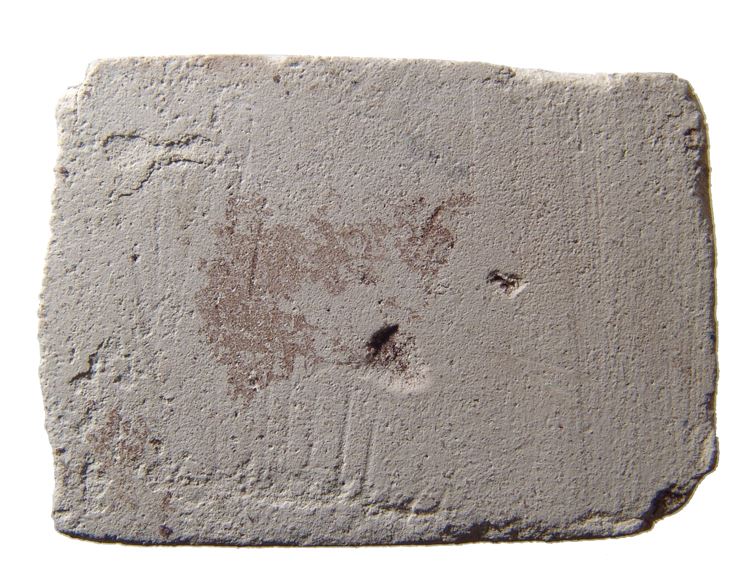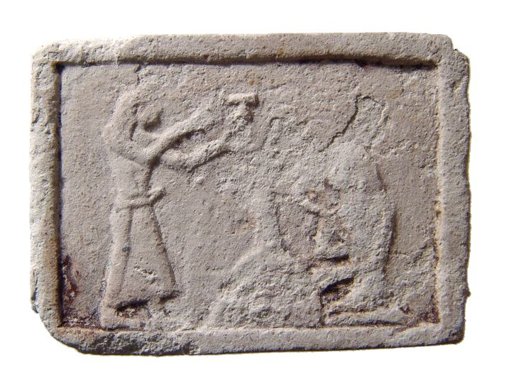 An Egyptian limestone plaque with two figures, Late Period, c. 664 - 30 BC, a male figure at right stands holding offerings with both hands, an altar before, to left a woman kneels holding an offering in her left hand. Some surface weathering but still quite nice with mineral deposits within the recesses. 2 3/8 in x 1 3/4 in (6 x 4.4 cm). Ex San Diego private collection.