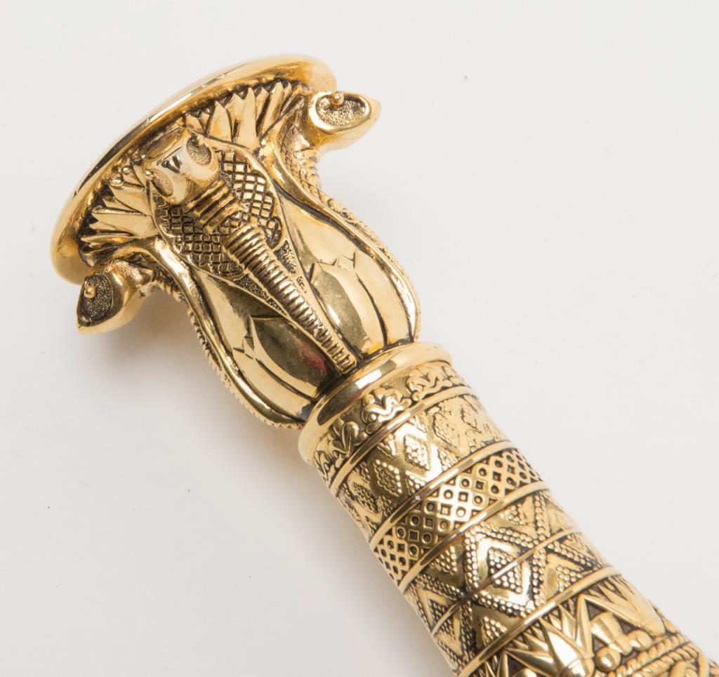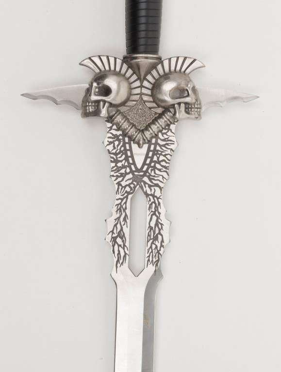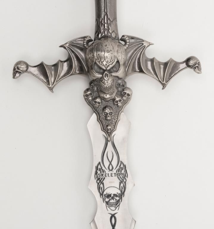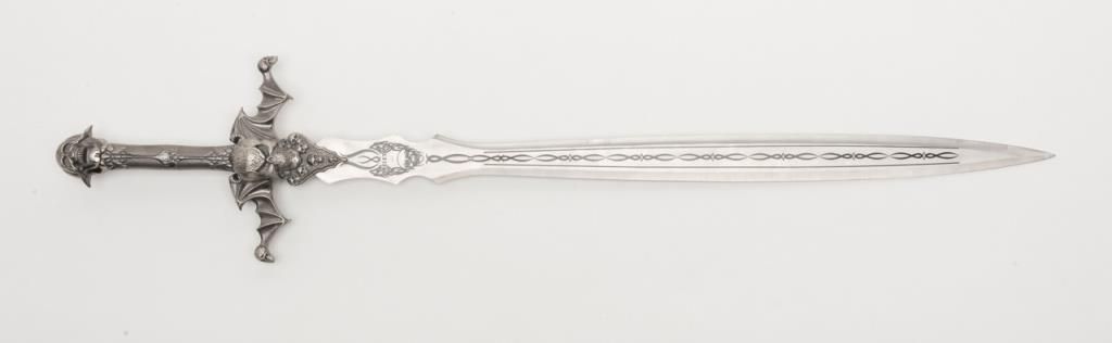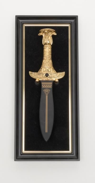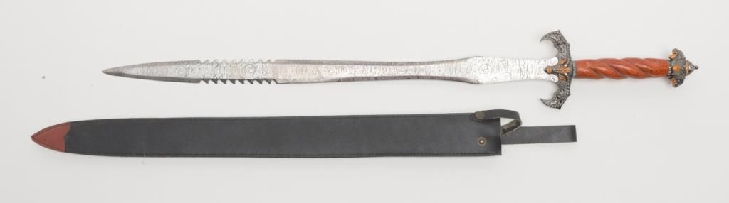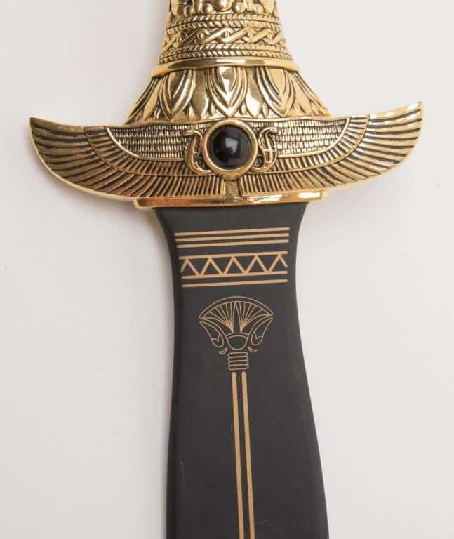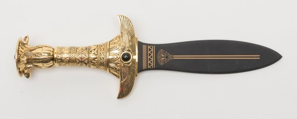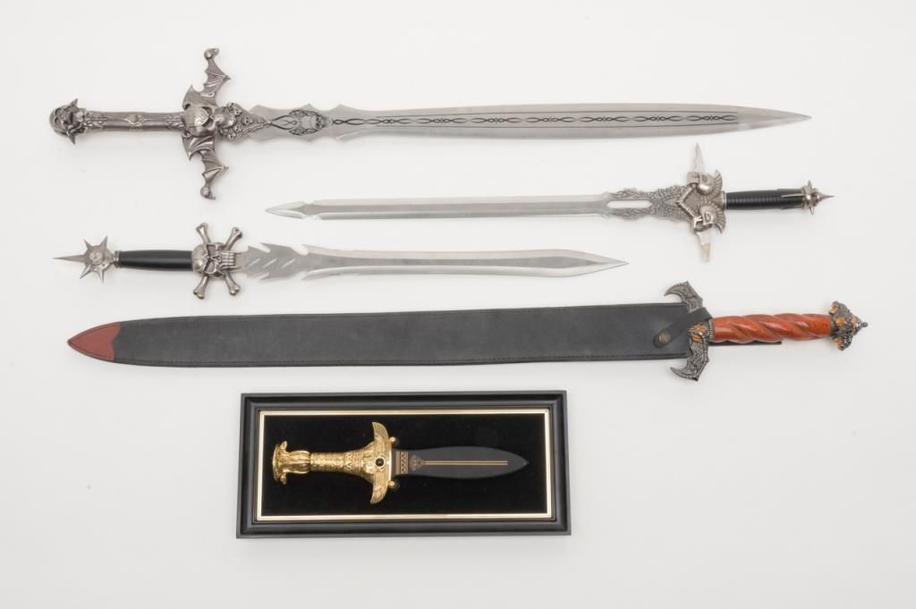 Egyptian-style dagger on plaque and 4 “fantasy” swords. Cost consignor over $500. Est.: $100-$200.