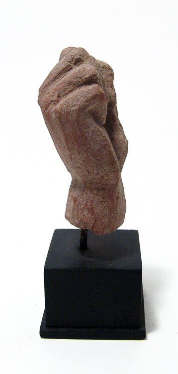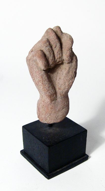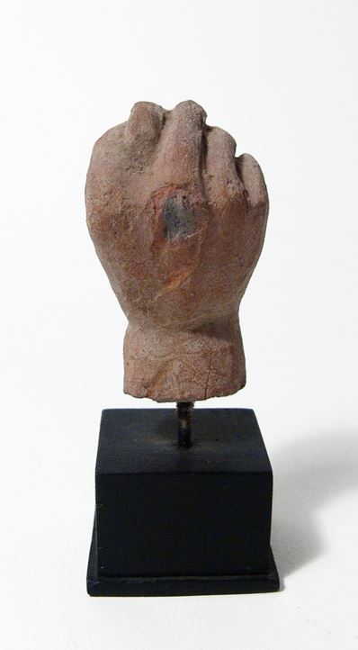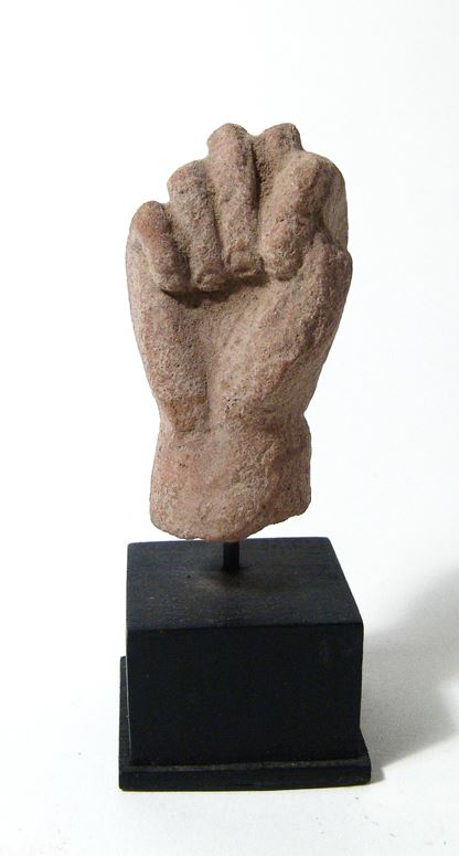 An Egyptian terracotta fist from a larger figure, Roman Period, c. 1st - 3rd Century AD, the thumb pressed between the index and middle finger, each digit nicely detailed. H: 2 ½ in (6.4 cm). Custom stand. Ex Philadelphia private collection.