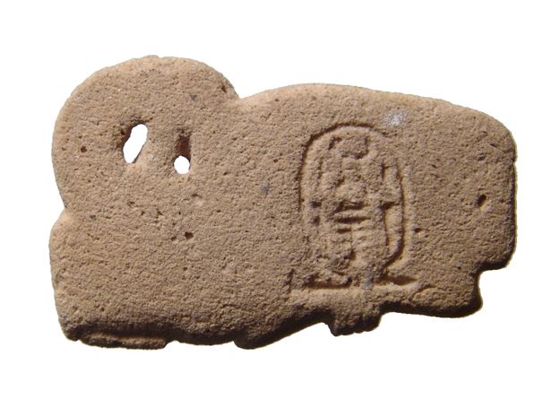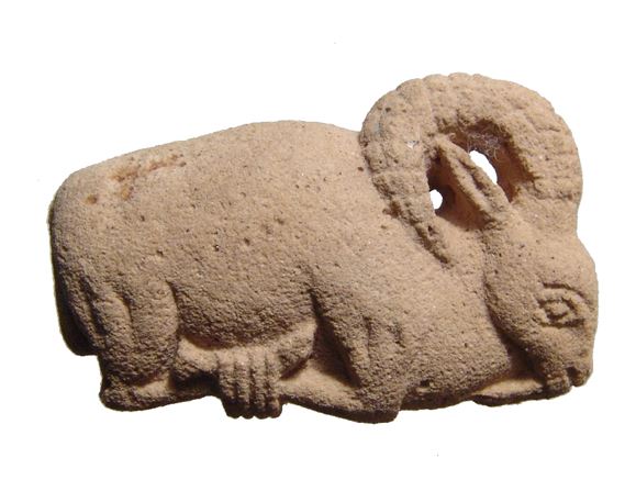 A choice Egyptian yellow-composite figure of a trussed horned goat, 2nd Intermediate, c. 1750 - 1570 BC, with exquisite detail and style, the flattened backside incised with a cartouche containing a Kheper beetle flanked by Falcons and Djed pillar of Osiris flanked by uraei, perhaps the prenomen of one of the kings from this period, since this same cartouche is commonly found on scarabs from the same time. A rare and most interesting piece! 4 x 2.5 cm. Intact. Ex San Diego private collection.