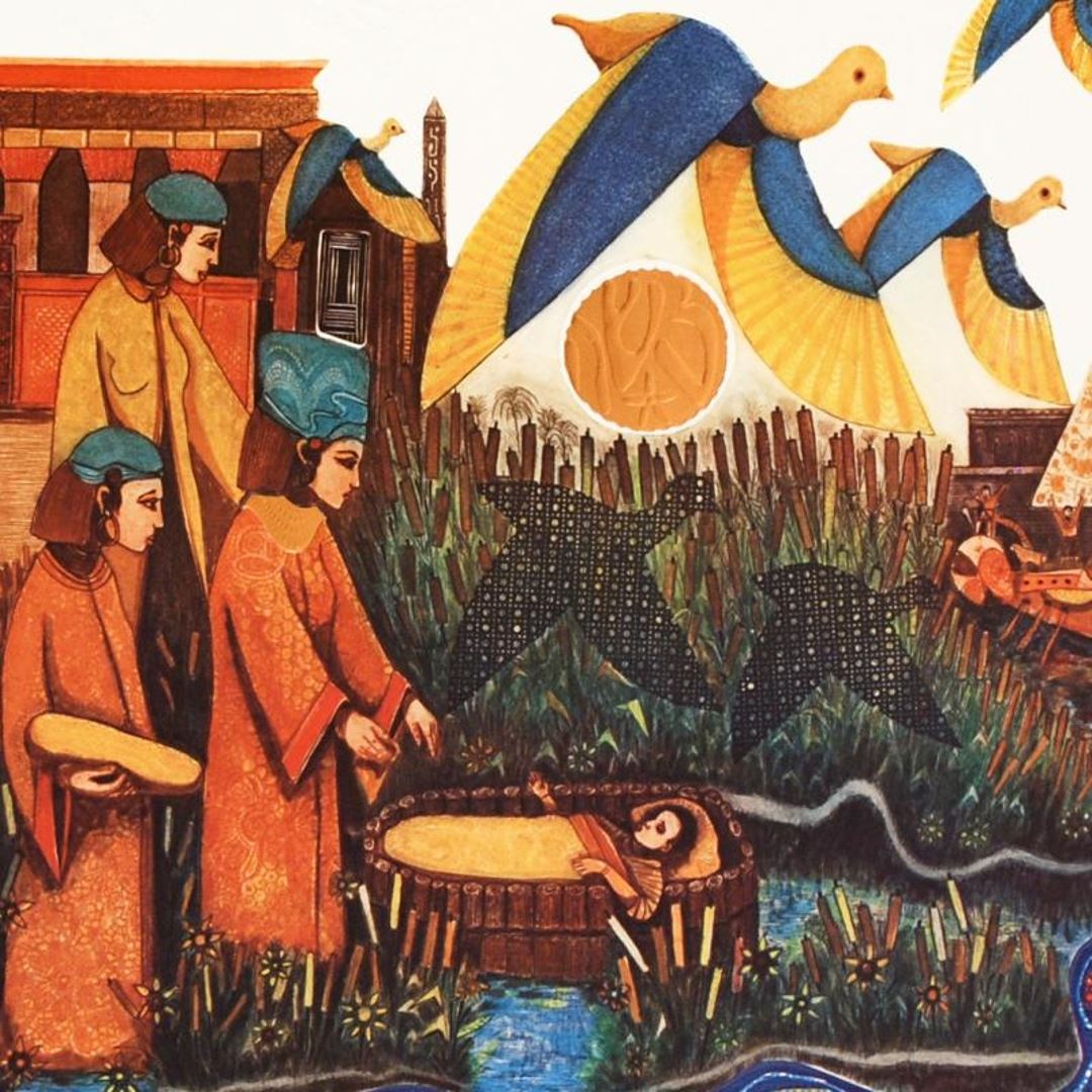 "Egyptians Embrace" is a limited edition embossed lithograph on paper, numbered and hand signed by Amram Ebgi. Includes Certificate of Authenticity! Measures approx. 19" x 14" (with border), 16" x 9.5" (image).