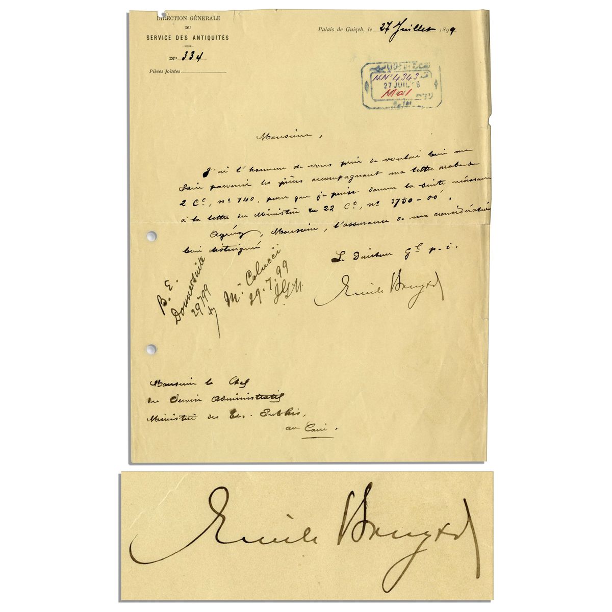 German Egyptologist Emile Brugsch signs his name to a document written in French from the ''Palais de Guizeh'' on 27 July 1899. Brugsch signs ''Emile Brugsch'' as Director General of the ''Service des Antiquites'' on official letterhead. The evacuation of a cache of mummies at Deir el-Bahri under Brugsch's direction in 1881 brought him notoriety and led to a curator position at the Bulaq Museum. Signed document measures 8.5'' x 11''. Some light chipping and toning, otherwise very good condition. Lot also contains two related documents.