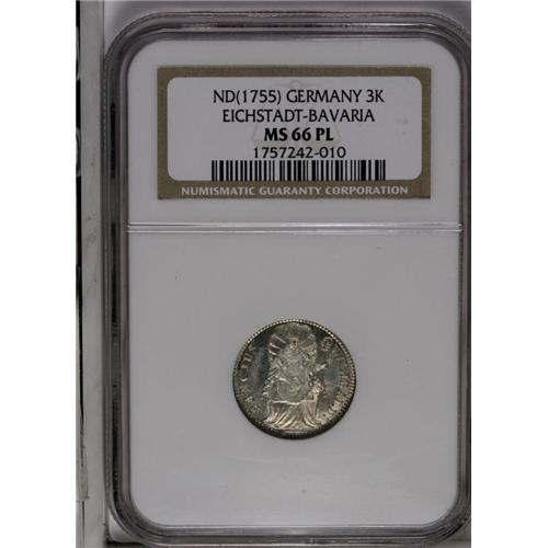 <B>Eichstatt. Johan Anton II 3 Kreuzer ND (1750-55), </B></I>KM65, MS66 Prooflike NGC, an incredibly flashy example of this scarce type.