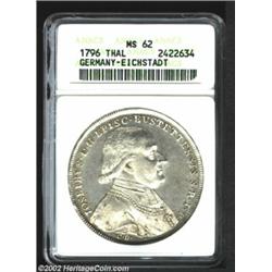 Eichstatt. Joseph Thaler 1796CD, KM97, MS62 ANACS, mostly brilliant with crudeness at borders, as struck. Important notice: We expect to be auctioning lots at the rate of 200-250 per hour. Sometimes eBay Premier live bid software cannot keep up with that pace, so we strongly recommend that you place a realistic proxy bid now as insurance to avoid disappointment. Also please note that all Heritage/CAA lots purchased through eBay Premier carry a 20% Buyer's Premium. Please make sure you read the Terms and Conditions.