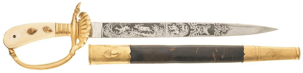 The knives of the State Forest Service (Staatsforstdienst) served as both tools and badges with the ivory and white celluloid grips reserved for senior officials. This example has a 13 inch blade with oak leaf etchings on the spine, etched forest scenes on each side and the Eickhorn logo on the left ricasso. Hoof shaped quillon, clamshell languet and ivory grips with 3 acorns on each panel (two are absent). Brown leather sheath with an acorn shaped frog stud. Good with some sheath wear, the gold darkened, an area of discoloration on the pommel and two acorns absent from the grip. The sheath is very good with scuffing on the leather.