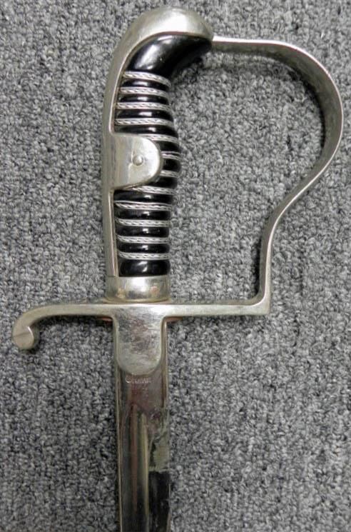 This is a Eickhorn Solingen Nazi Wehrmacht Sword and Scabbard. It has a celluloid grip and nickel hilt furniture with doves head pommel. Very nice 35" blade with some slight wear and scuff marks throughout. The makers mark: Eickhorn Solingen is on the ricasso. Worn black scabbard with hook and scuff marks-nice patina to the hilt and cross guard. Overall length is 41".