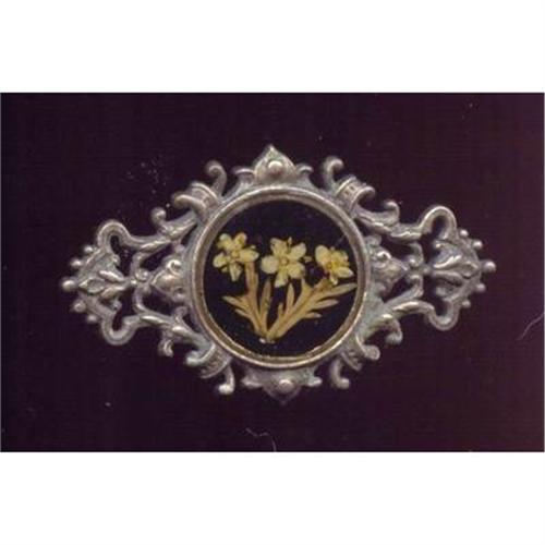 This unusual brooch looks very European to me. It is a silver base metal rather ornate setting with a trombone type clasp. There are dried flowers under a clear celluloid covering. The brooch measures 2 inches long and 1 1/8ths inches tall. It is in good condition with no markings.