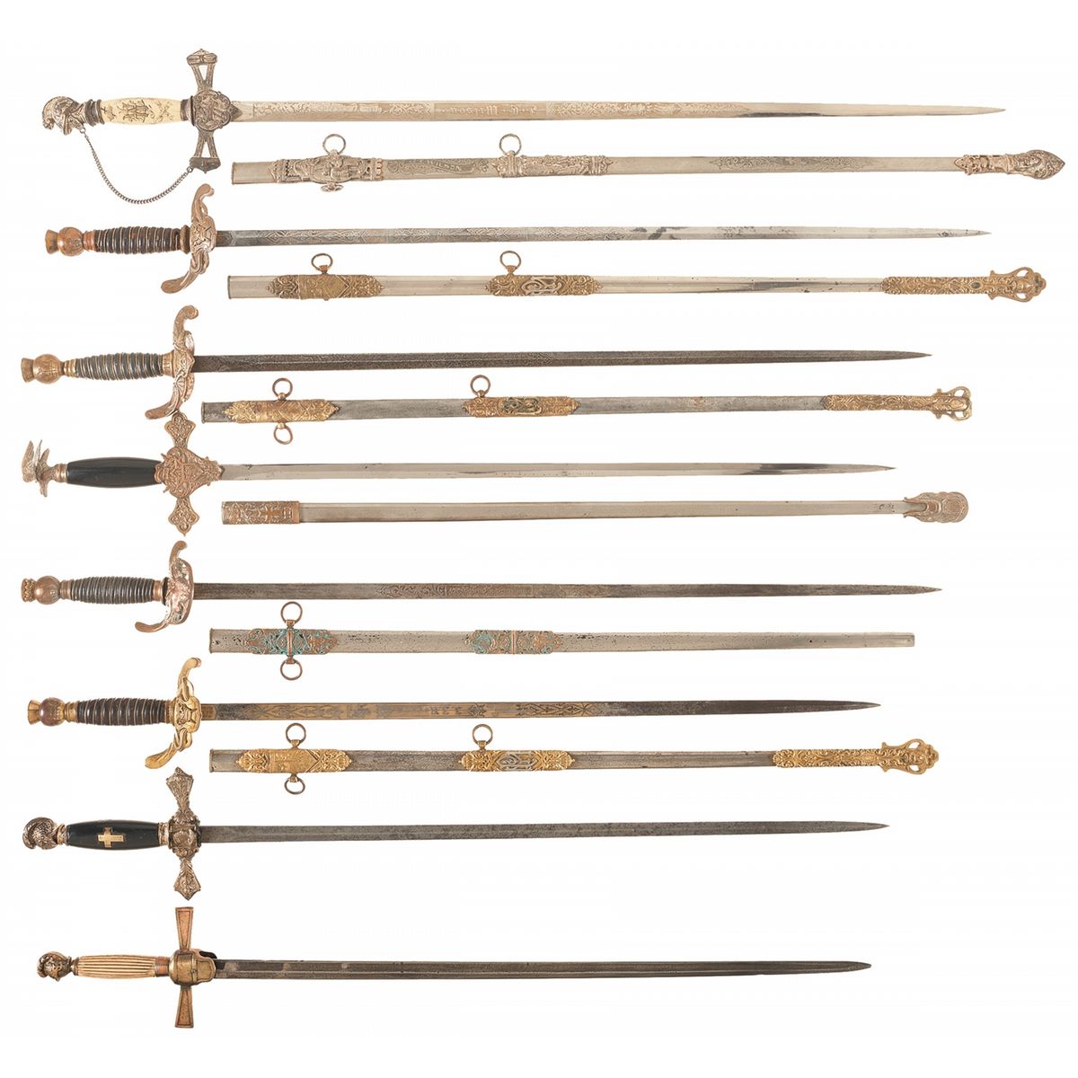 1) C.E. Ward Knight's Templar lodge sword, 38 3/4" long, 32" etched blade, Holyrood Commandry marked grip, matching scabbard. Very good. 2) Morgan, Puhl & Morris Patriarchs Militant sword, 38" long, 31 3/4" etched blade, brass guard, leather grip, nickel and brass scabbard. Good. 3) Pettibone Patriarchs Militant sword, 36 1/4" long, 30" blade, leather grip, metal scabbard. Fair. 4) Knights of Columbus sword, 34 3/4" long, 28 1/4" blade, brass fittings, ebony grip, meal scabbard. Good. 5) Henderson-Ames Loyal Order of Moose lodge sword, 36 1/2" long, 31" blade, brass fittings, nickel scabbard. Scabbard tip absent, otherwise fair. 6) M.C. Lilley Patriarchs Militant sword, 34" long, 28" gold washed etched blade, gilt fittings, nickel scabbard. Very good. 7) Knights Templar sword, 34 3/4" long, 27 3/4" blade, nickel fittings, wood grip. Fair. 8) Unmarked sword, 33 1/2" long, 27" blade, ribbed bone grip. Poor.