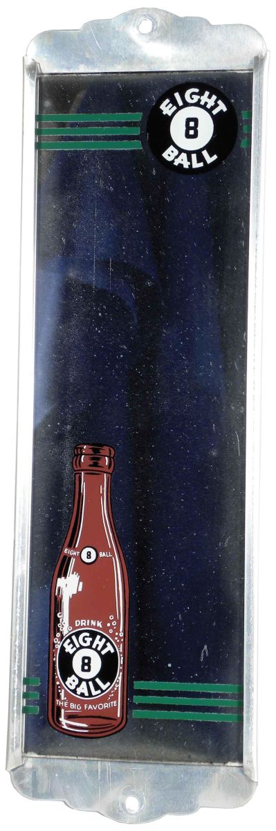 Eight Ball Soda Mirror, aluminum frame. Excellent condition. 3 1/2 X 12 inches. Start Price $20