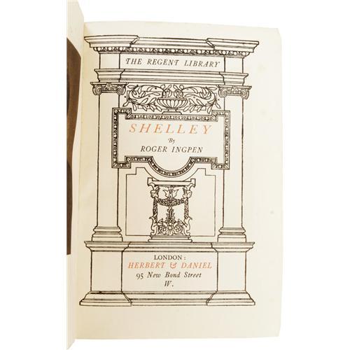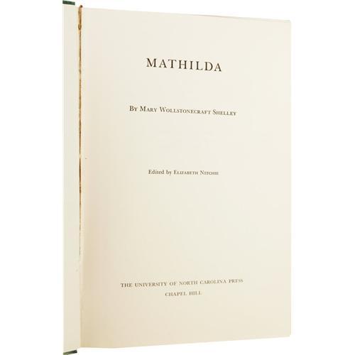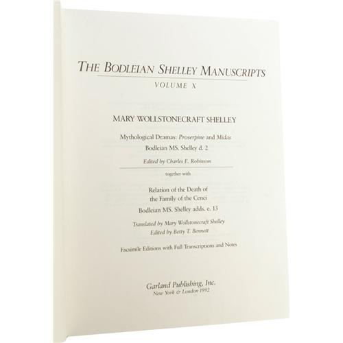<B>Eight Book Collection of Mary Shelley Fiction and Reference Works.</B></I> Includes the following: <BR><B>Mary Shelley: <I>Mathilda.</B></I></B></I> (Chapel Hill: University of North Carolina Press, 1959), 104 pages, green cloth with gilt lettering on spine, 8vo (6" x 9.25"). Includes Mary Shelley's story "The Swiss Peasant", along with Washington Irving's "The Contented Man". This copy is good, with some minor corner wear, and one small wrinkle at the head of the spine. Front hinge starting.<BR><B>E.V. Lucas, editor: <I>Mary Wollstonecraft's Original Stories</B></I></B></I> (London: Henry Frowde, 1906), 88 pages, green cloth with gilt lettering on spine and decoration on front board, 16mo (4.75" x 6.75"). Illustrated by William Blake. This copy is good, with bumped corners, and minor wear to the spine. A few white paint spots visible on front cover and spine, which ever so slightly cocked.<BR><B>Richard Garnett, editor: <I>Tales and Stories by Mary Wollstonecraft Shelley.</B></I></B></I> (London: William Paterson & Co., 1891), 386 pages, maroon half-cloth with decorative cloth boards, 12mo (5.25" x 7.5"). Good condition, with minor edge, corner and spine wear. Textblock tight and clean.<BR><B> Various Authors : <I>The Tale Book.</B></I></B></I> (Paris: Baudry's European Library, 1834), 438 pages, brown banded half-leather with marbled boards, 8vo (5.25" x 8.5"). Good, with some edge, corner, and spine wear, wear at the hinges, and some foxing to the textblock.<BR><B>Mary Shelley: <I>Proserpine & Midas.</B></I></B></I> (London: Humphrey Milford, 1922), 89 pages, green cloth with gilt lettering and decoration on spine and decorative blind stamping on boards, 16mo (4.75" x 6.75"). Edited by A. Koszul. Two unpublished Mythological Dramas. Two ownership names in pen. Pencil inscription to Betty Bennett on front free endpaper. This copy is good, with some edge, corner, and spine wear. Textblock is clean.<BR><B>Mary Shelley: <I>The Beautiful Widow</B></I></B></I> (Philadelphia: T. B. Peterson & Brothers, nd), 244 pages, brown cloth with gilt lettering on spine and decorative blind stamping on boards, 12mo (5.5" x 7.5"), clear glassine cover. This copy is good, with some edge, corner, and spine wear. Textblock shows some foxing throughout.<BR><B>Charles E. Robinson and Betty T. Bennett, editors: <I>The Bodleian Shelley Manuscripts, Volume X.</B></I></B></I> (New York: Garland Publishing, 1992), 272 pages, blue cloth with gilt lettering on spine, Folio (9.25" x 12.25"). Includes facsimile editions with full transcriptions and notes. Fine condition, with light soiling on the covers. Textblock as new.<BR><B>Roger Ingpen: <I>Shelley.</B></I></B></I> (London: Herbert & Daniel, nd), 570 pages plus 12 pages of advertising, beige cloth with gilt lettering and decoration on spine and boards, 12mo (5" x 7"). Good condition, with moderately soiled boards, some edge, corner and spine wear, and corners lightly bumped. <I>From the Betty Bennett Collection.</B></I><BR><BR><b>Shipping:</b> Books & Catalogs (<a target="_blank" href="http://www.heritageauctions.com/common/shipping.php">view shipping information</a>)