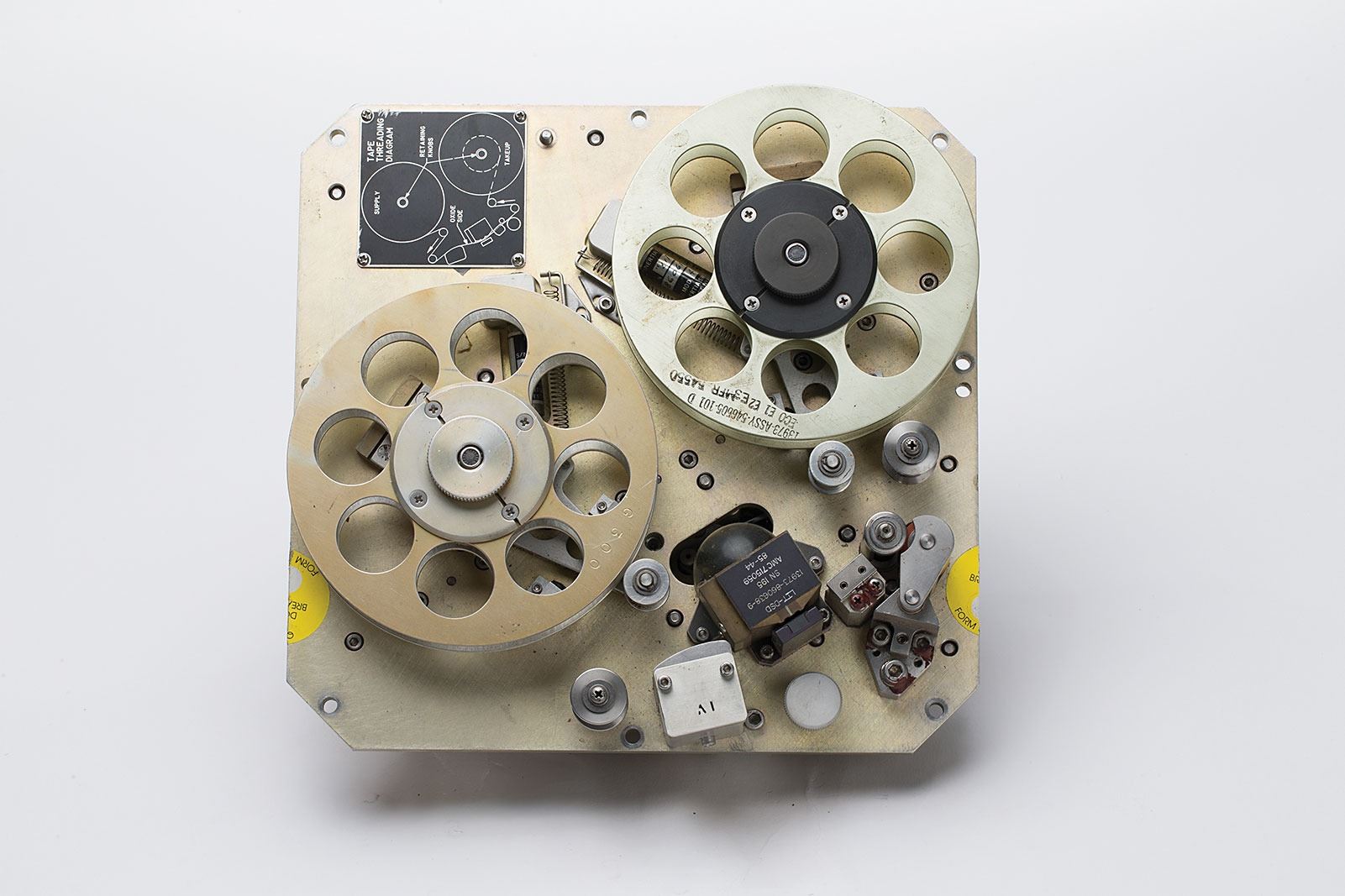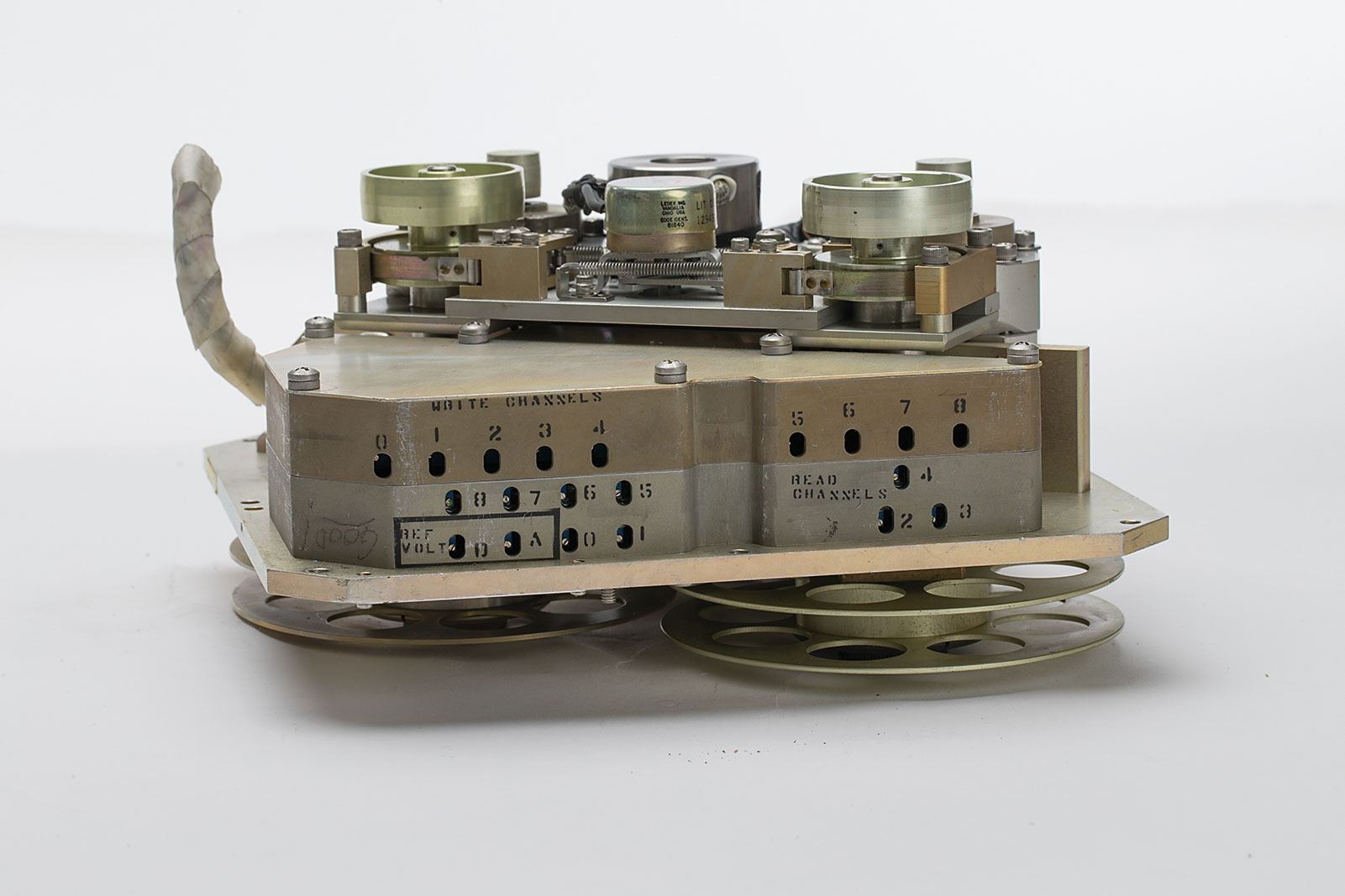 Eight-channel airborne flight recorder for an aircraft, measuring 9? x 9? x 4.75?, featuring two reels and a tape threading diagram on the face. The unit is marked on the underside, "13973ASSY, 546501-102, S/N 963" and "13973ASSY547290-100, SEAX0 831," among other part numbers and markings. In fine condition. An intricate and interesting piece of aviation hardware.