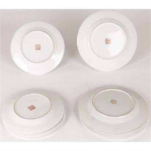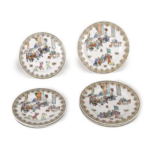 <B>Eight Chinese Famille Rose Plates<BR></B></I>Unknown maker<BR>Twentieth Century<BR>The eight plates, four side plates and four salad plates, all with decorative court interior scenes of children playing under the watchful eyes of adults<BR>Red chop mark to the underside<BR>The side plate: 8 inch diameter; The salad plate: 9 inch diameter<BR><BR><b>Shipping:</b> Requires 3rd Party Shipping (<a target="_blank" href="http://www.heritageauctions.com/common/shipping.php">view shipping information</a>)