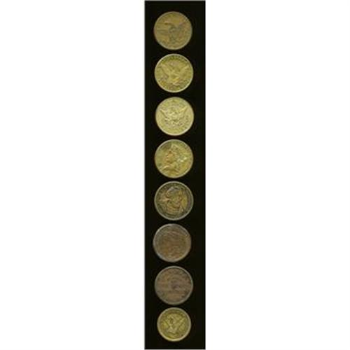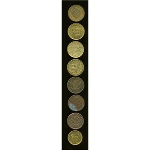 <B>Eight Coin-Device Merchant and Political Tokens.</B></I> Each item incorporates a device from then-circulating U.S. coinage, such as the Gobrecht eagle or the wreath on the reverse of the large cent. Includes <B>A.B. Van Cott, Racine, Wisconsin</B></I>, Miller-WI-10, thick brass planchet; <B>Daniel Ball & Co., Grand Rapids, Michigan</B></I>; <B>N.C. Folger, New Orleans</B></I>; <B>Professor Johnson's Soap, New York</B></I>; <B>Louis Kossuth, The Washington of Hungary Political Token</B></I>; <B>S.H. Black, New York</B></I>, Miller-NY-0063, copper over lead; <B>C.A.M. Smith Dry Goods, Windsor, New York</B></I>, Miller-NY-1068; and a <B>Success to Republican Principles Political Token</B></I>, dated 1860.<BR><BR><b>Shipping:</b> Coins & Currency (<a target="_blank" href="http://www.heritageauctions.com/common/shipping.php">view shipping information</a>)