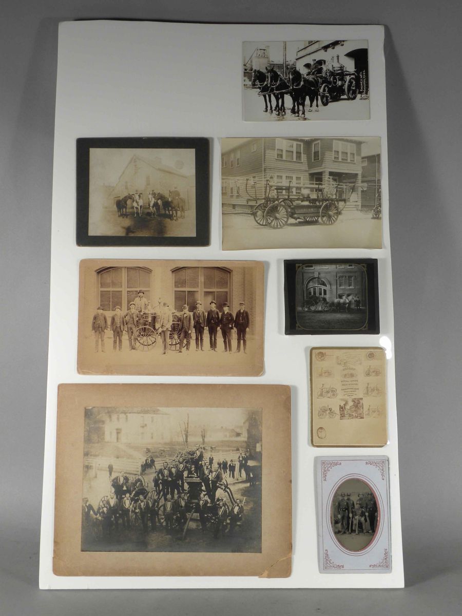 Lot of Eight Firefighting Photographs including glass slide, cabinet card and tin type. Various sizes and conditions.