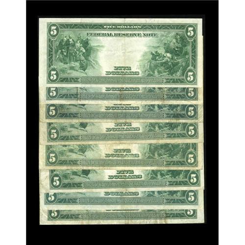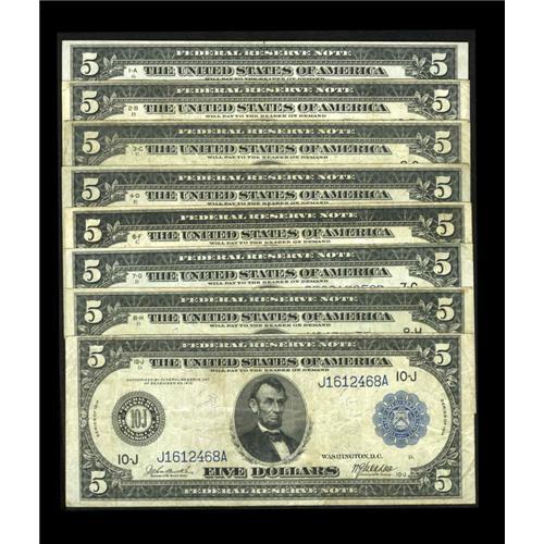 <B>Eight Five Dollar Feds From Eight Different Districts.</B></I> Fr. 847b Boston, Fr. 851a New York, Fr. 855a Philadelphia, Fr. 859a Cleveland, Fr. 867a Atlanta, Fr. 871a Chicago, Fr. 874 St. Louis and Fr. 880 Kansas City. The notes range from Fine to XF, with most VF.<BR><I>From The Ross Bailey Collection</B></I>