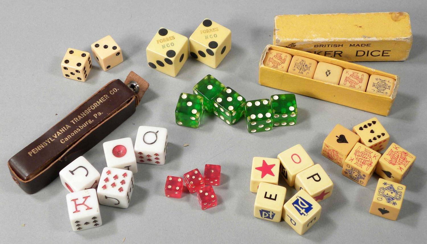 Lot of 8 Misc. Set of Dice. One set advertising the Pennsylvania Transformer Co., Canonsburg, Pa. Various sizes and conditions. Starting bid $20