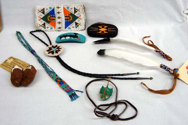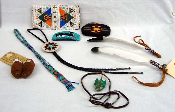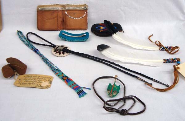 Eight Native American Hand Beaded Items. 1) Leather beaded miniature moccasins with information sheet, 2.75''L x 1.25''W. 2-3) Beaded zippered coin purse and wallet, 7''L x 3.5''H. The zipper on this purse is partially torn away from the fabric. 4) Hand woven bolo tie with turquoise cabochon. 5) Pair of prayer feather and beaded braid or ponytail ties,by Joe Rodriguez of South Dakota 6) Beaded Train Engine Hair barrette, 4''L x 1.5'' W. 7) Animal skull pendant on leather necktie. 8) Hand beaded necklace. Pendant has 6 strands of beads over the head style.