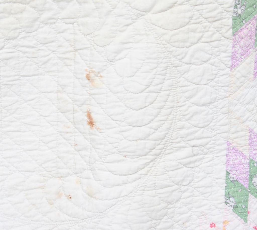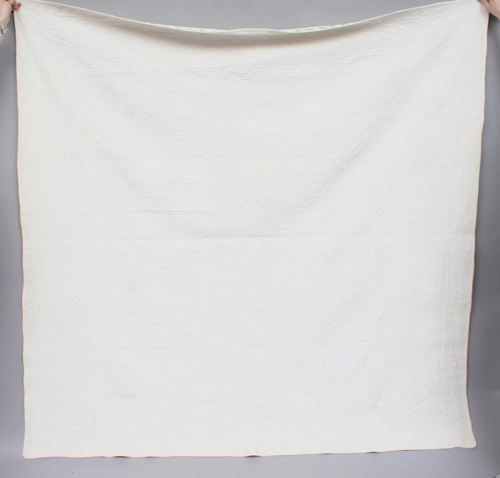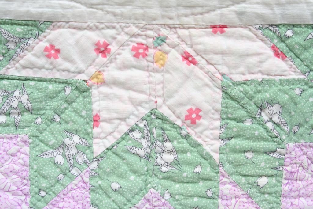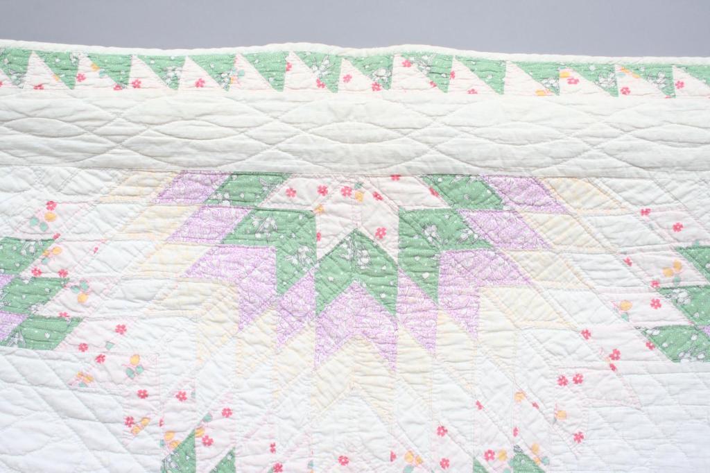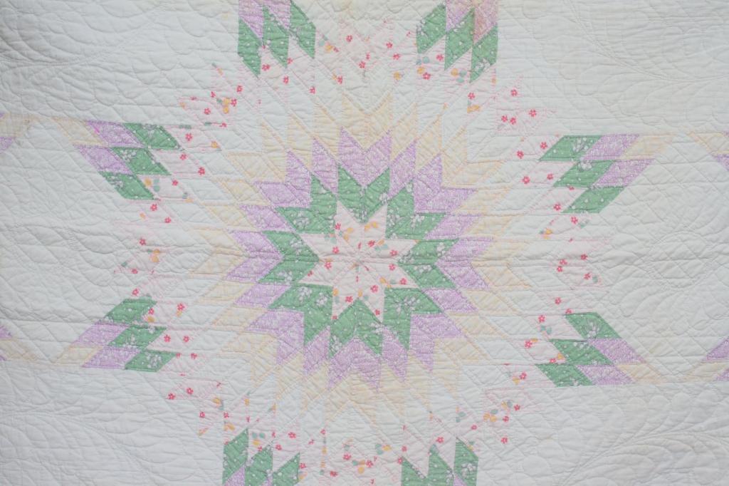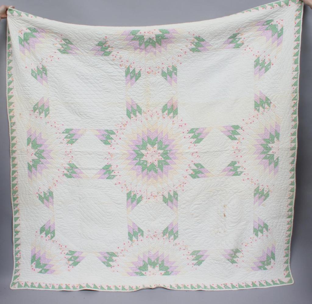 First half of 20th century, centered with an eight point star enclosed on a field with nine medallions, constructed in pink, green, lavender, and peach calico on a white ground. 6'5" x 6'5". Condition: some uniform fading, generally very good, no damage or repair.