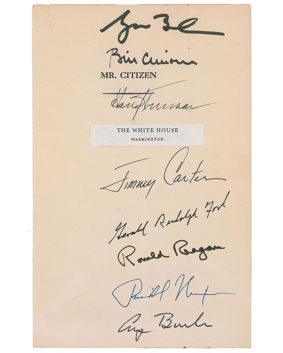 Unique half-title page removed from Harry S. Truman’s Mr. Citizen, 5.5 x 9, signed in ink and felt tip by eight former presidents: “George W. Bush,” “Bill Clinton,” “Harry S. Truman,” “Jimmy Carter,” “Gerald Rudolph Ford,” “Ronald Reagan” (as president), “Richard Nixon,” and “George Bush.” A clipped caption is affixed to the center, covering a Clinton autopen signature. In fine condition, with a small tear to top edge, and some mild surface rubbing from erased pencil notations. Accompanied by a notarized letter verifying Reagan’s signature from during his presidency; a letter from Senator Mitch McConnell regarding the George Bush signature; and a ticket to an August 30, 1996, Clinton/Gore event where Clinton’s signature was obtained. This very page was featured in an article in Pen and Quill magazine when it had been signed by six presidents, used as an example of an authentic George Bush signature, and referred to as ‘superb.’ Truman’s signature dates from the late 1950s or early ’60s, with the other signatures acquired during the ’80s and ’90s. A one-of-a-kind set, this page holds the highest quantity of presidential signatures on a single item we have ever offered.