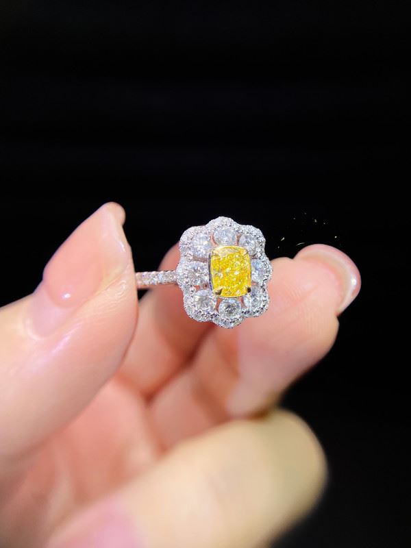 This eight-prong floral straight band ring features a dazzling yellow diamond at its center, surrounded by clear, brilliant diamonds that create an elegant flower design. The eight-prong setting enhances the ring's dimensionality and brilliance, with the radiant yellow diamond complementing the purity of the surrounding diamonds. The clean, straight band design highlights the elegance and nobility of the wearer, making it a luxurious and romantic piece.Ring size: 6, circumference: 52 mm, diameter: 16.6 mm, main diamond: 0.62 ct, side diamonds: 0.836 ct. Note: GIA Natural Diamond Report.