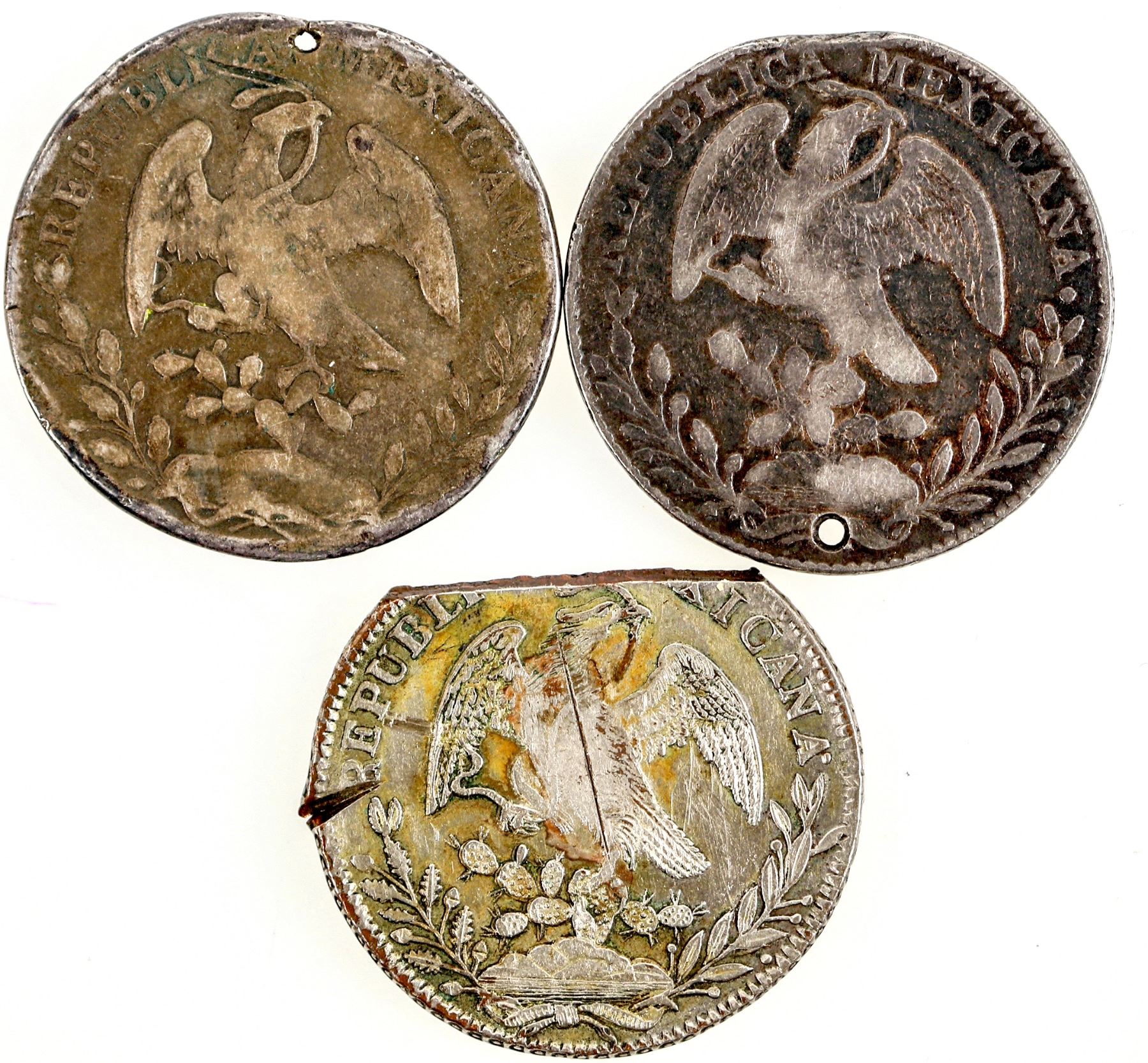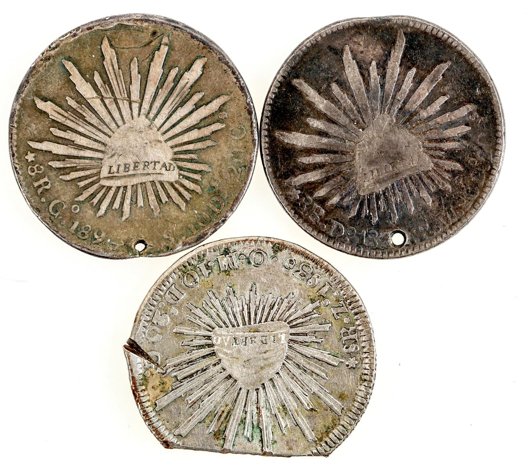 Three Mexican eight reales: 1) 1836, clipped at top, rim cut right side. 2) 183?, holed, rim ding. 3) 1896, holed, rims worn.