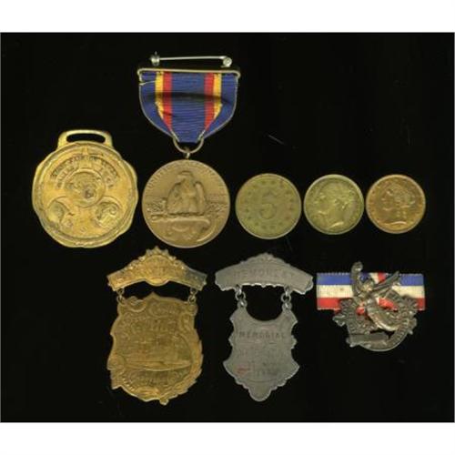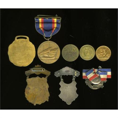 <B>Eight Tokens and Medals.</B></I> A wide range of tokens and medals including a scarce <B>Arizona token </B></I>issued by T.J. Riley, of Quincy Az.; a souvenir of the <B>Ice Palace</B></I> in<B> </B></I>Leadville, Colo., dated 1896; a <B>Prohibition silver badge;</B></I> plus a few other interesting items. <BR><BR><b>Shipping:</b> Coins & Currency (<a target="_blank" href="http://www.heritageauctions.com/common/shipping.php">view shipping information</a>)