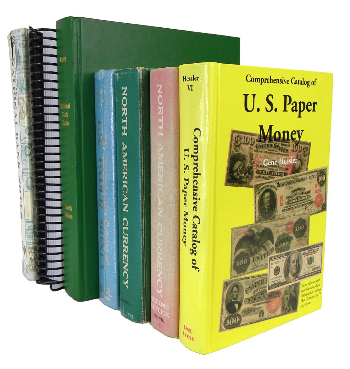 [Paper Money]. EIGHT WORKS ON PAPER MONEY. Includes: Hickman and Oakes’s 1982 Standard Catalog of National Bank Notes; the fifth edition of Hessler’s Comprehensive Catalog of U.S. Paper Money, still in shrink-wrap; the sixth edition of the same; the first edition of Criswell’s North American Currency; the second edition of the same; the fourth edition of Don Kelly’s National Bank Notes; the fifth edition of the same; and the program of the First International Paper Money Convention, 1985. Varying formats, first six titles hardcover. Very good or better. Includes some substantial works.