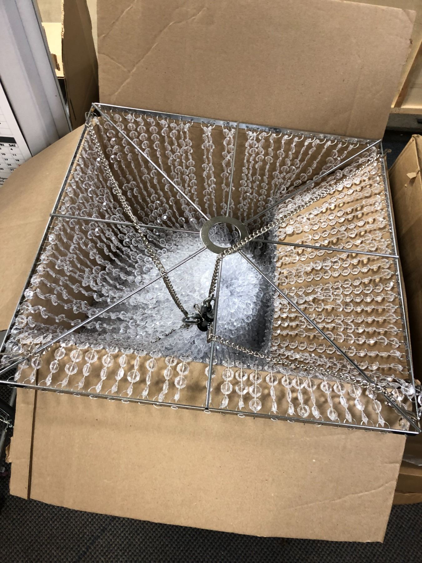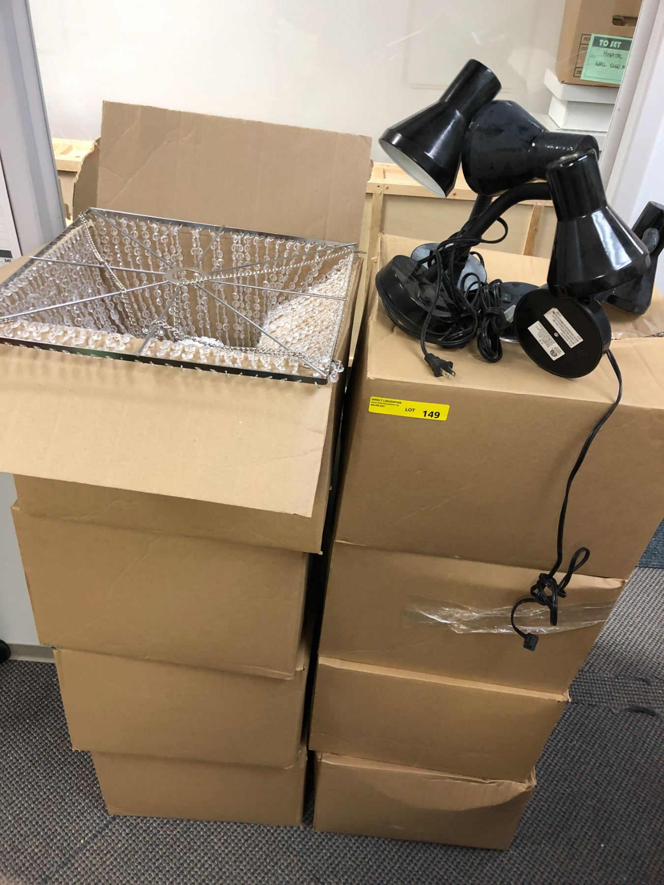 Eight boxes of Hanging Beaded Lights from Shark Party and 4 black table lights.