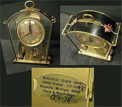 Eight day Schatz clock Made in Germany. With applied flowers to case, plastic "glass" sides and front. Stands almost 5" tall