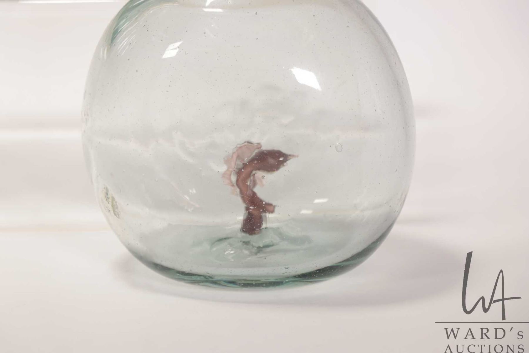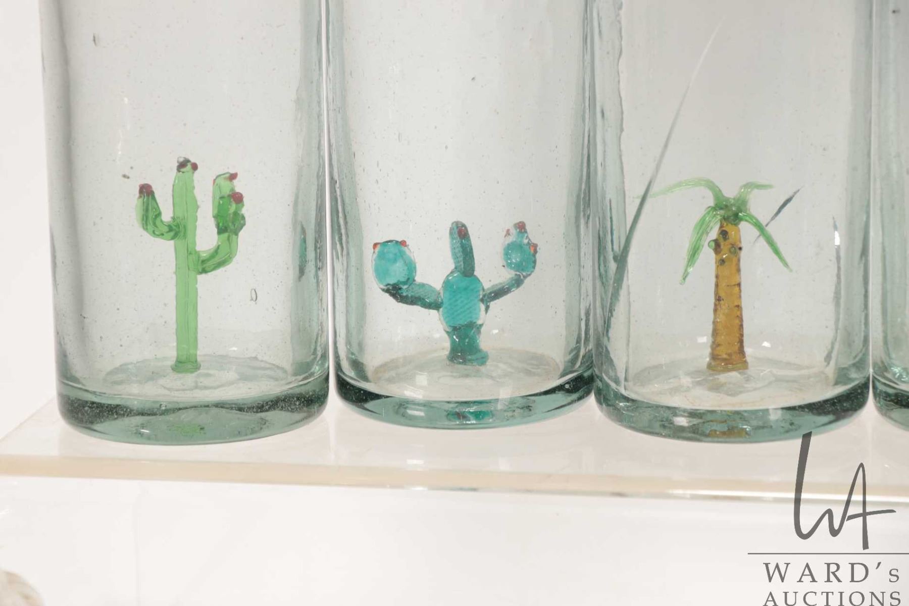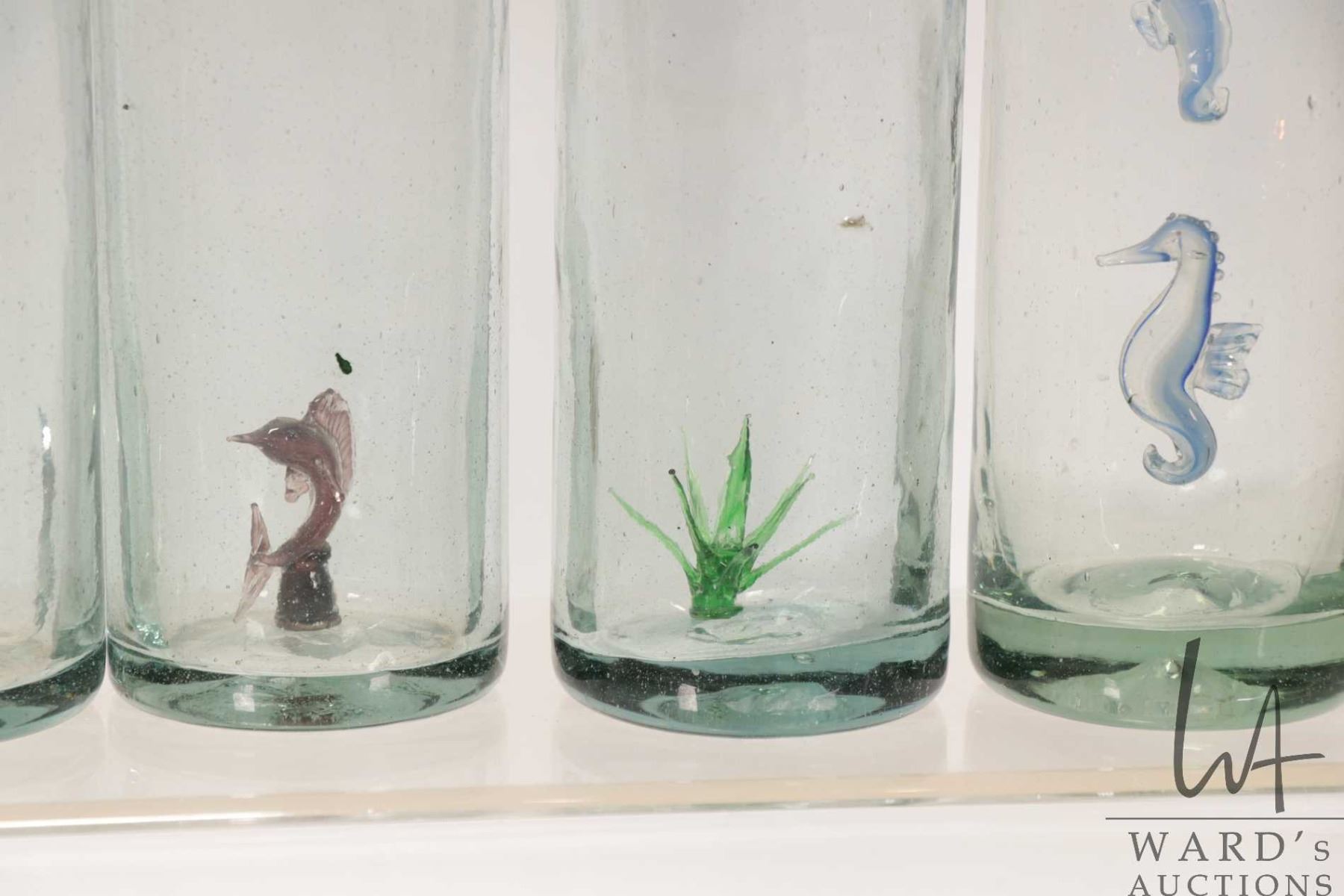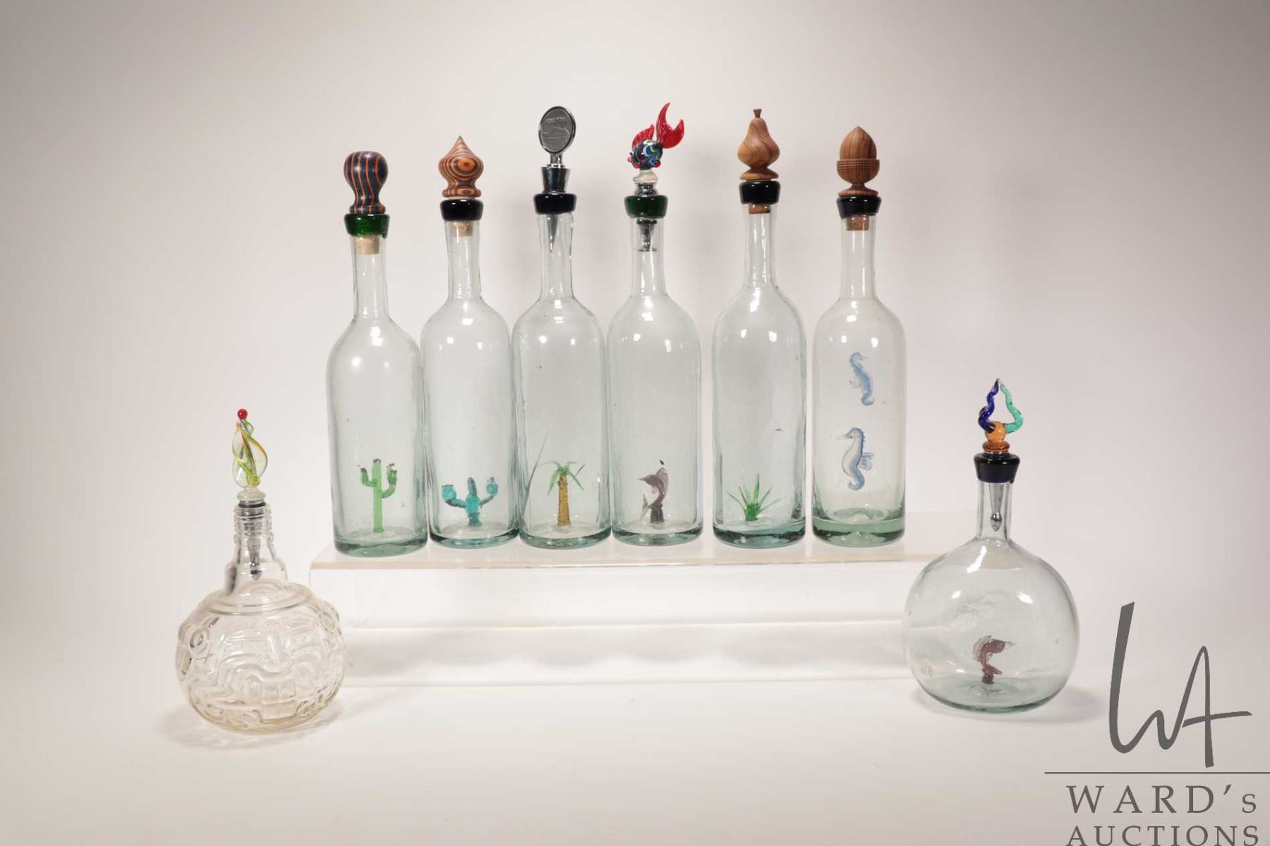 Eight decorative glass bottles, six of which have attached internal accent and each have decorative
