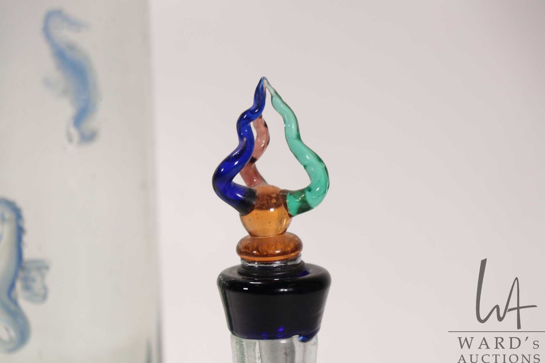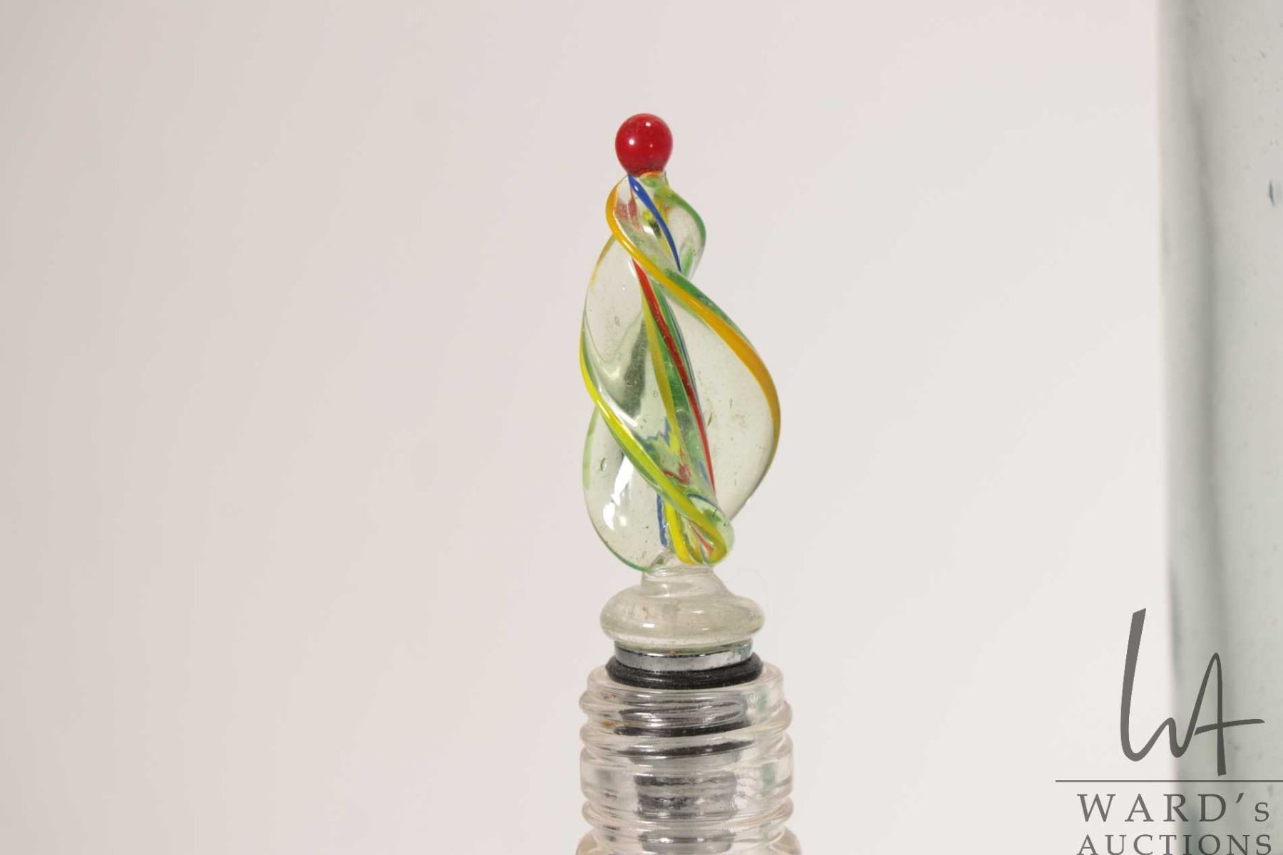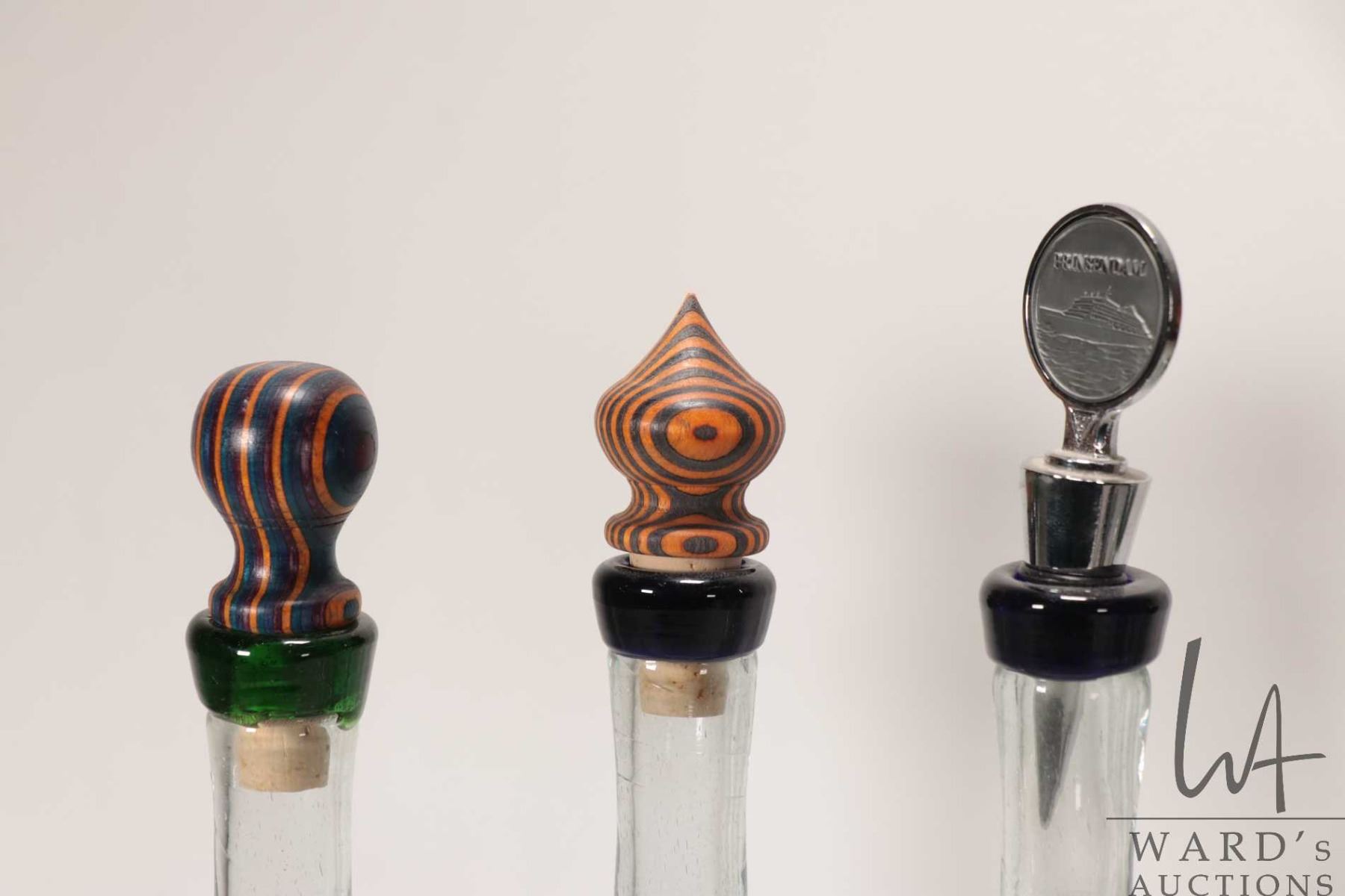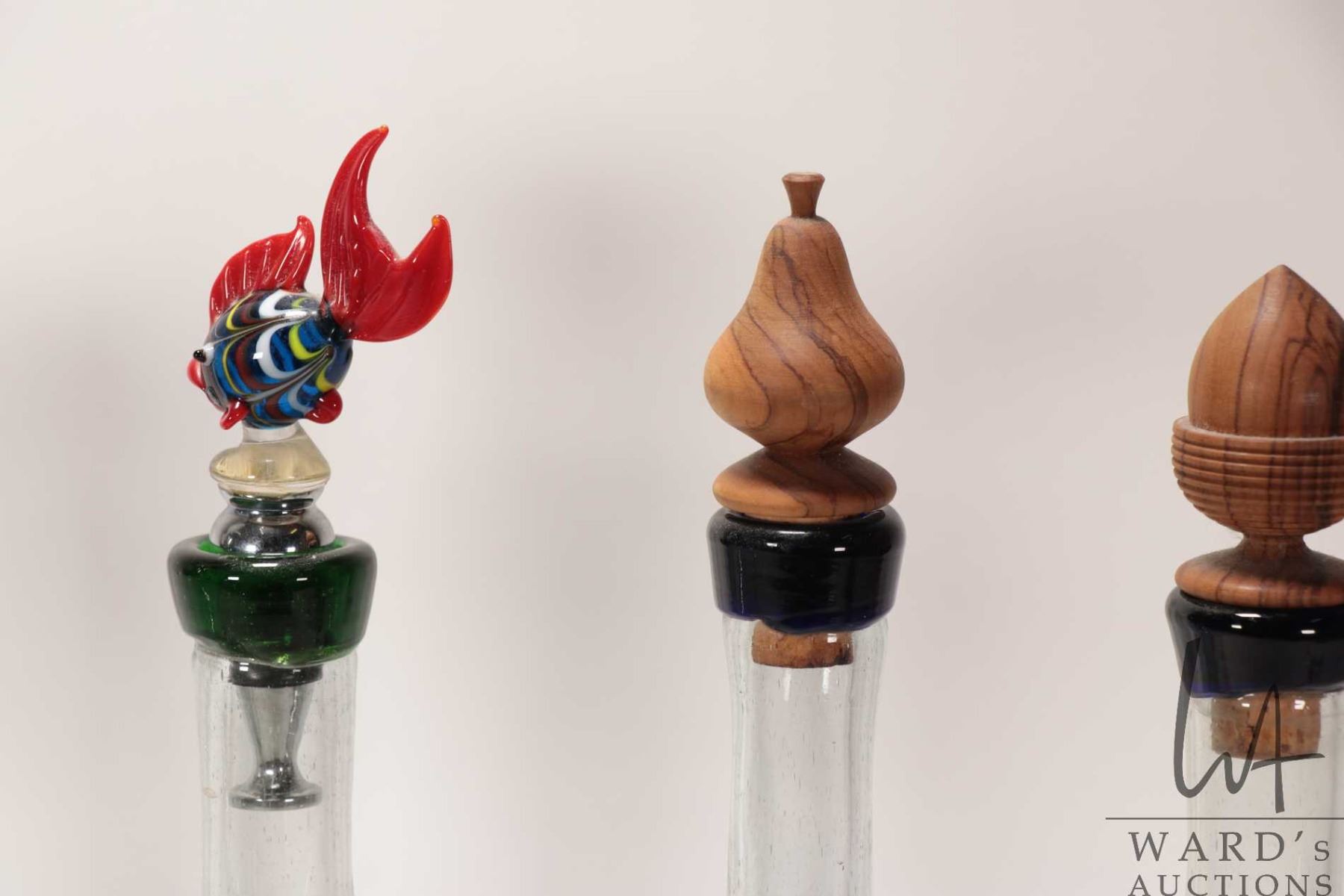 Eight decorative glass bottles, six of which have attached internal accent and each have decorative stopper. Note: One bottle cracked but intact