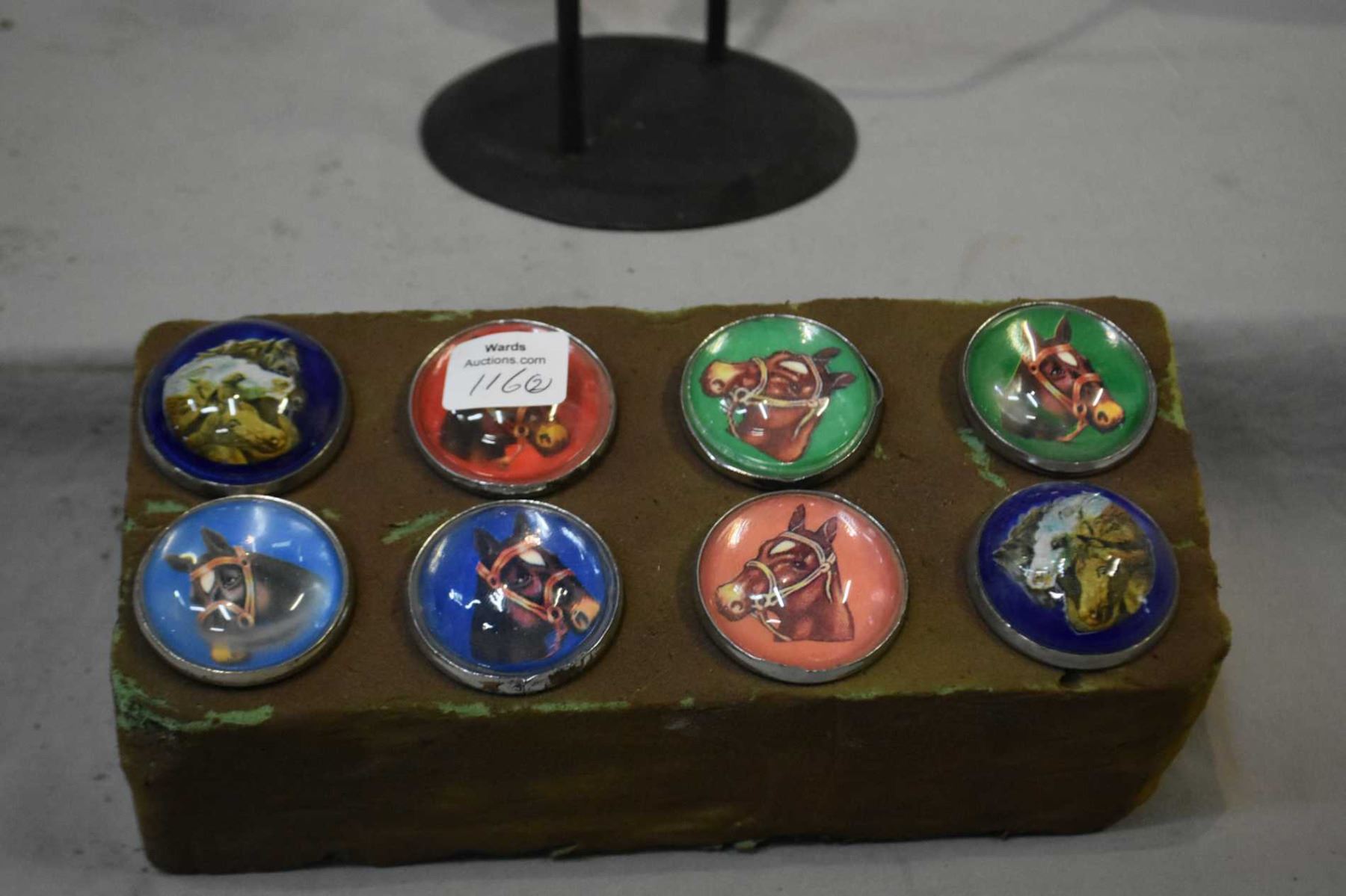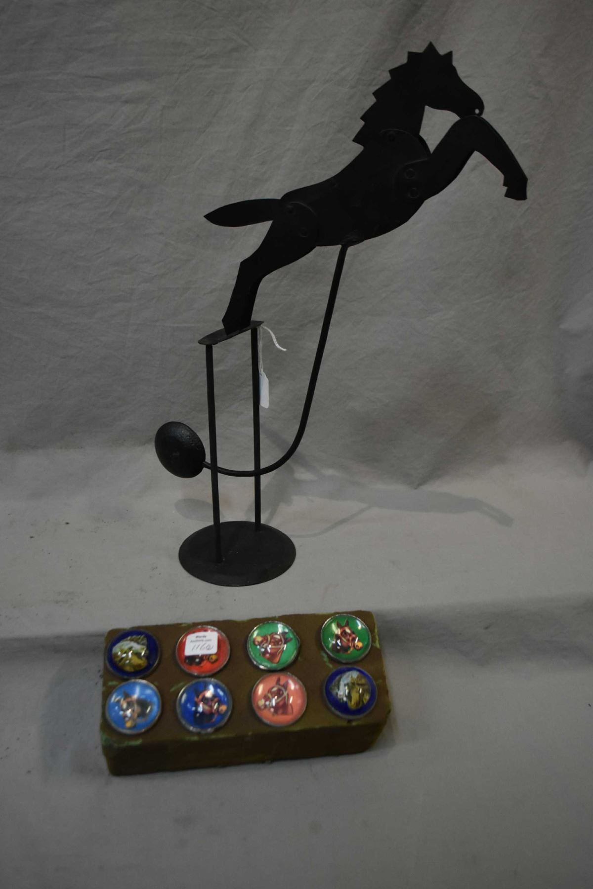 Eight horse motif glass saddle buttons and a metal works horse motif rocking pendulum 18" in height