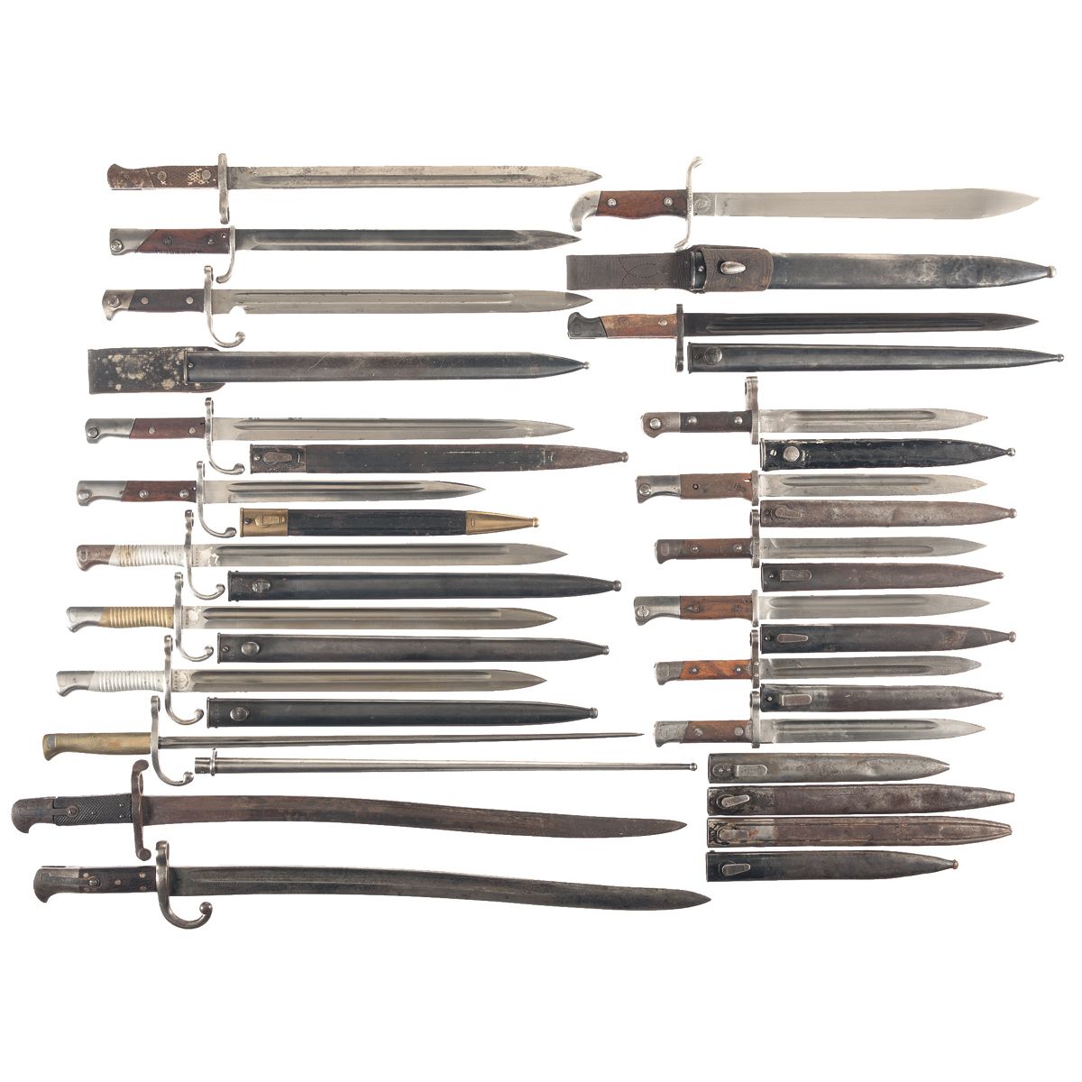 Lot includes 3 loose sheaths, 1 loading tool, and a German knife with Argentine markings. All are fair or better.