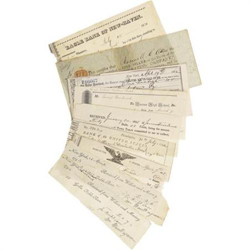 <B>Eighteen Pieces of Early Ephemera,</B></I> a splendid diverse group of mostly 18th and 19th century material. The one 20th century item is a 1918 receipt affixed with a yellow sticker bearing what is surely a prototype “smiley face.” Other highlights include:<BR><B>1805 Thanksgiving Ball Invitation,</B></I> imprinted on Queen of Diamonds playing card.<BR><B>1794 and 1808 Bank of the United States receipts.</B></I><BR><B>Two 1794 New York partially printed receipts for beer.</B></I><BR><B>1838 British silversmith's receipt,</B></I> partially printed.<BR><B>1800 New York tobacco receipt, </B></I> partially printed.<BR><B>Ticket for “Campbell's Minstrels”,</B></I> mid-19th century. Attractive.<BR>Items are in fine to very fine condition. <I>From the collection of Henry E. Luhrs.</B></I><BR><BR><b>Shipping:</b> Flat Material, Small (<a target="_blank" href="http://www.heritageauctions.com/common/shipping.php">view shipping information</a>)