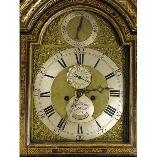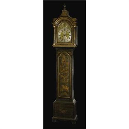 <B>An Attractive Eighteenth Century English Chinoise Tall Clock</B></I><BR><BR>Rimbault, London, England<BR>Eighteenth Century<BR>Painted wood, giltwood<BR>Marks: <I>Step. Rimbault, London, 1734</B></I><BR>96 inches high x 20 inches wide x 10 inches deep<BR><BR>With pierced sides, decorated brass face, pediment in Chinoise form, hand-decorated floral motif flanked by wooden three-quarter columns over slender case with gilt Chinoise motif applied to door, decorated base with bracket feet.<BR><BR> <B>Condition Report:</B> Recent retouching, side glass missing.<BR><BR><b>Shipping:</b> Requires 3rd Party Shipping (<a target="_blank" href="http://www.heritageauctions.com/common/shipping.php">view shipping information</a>)